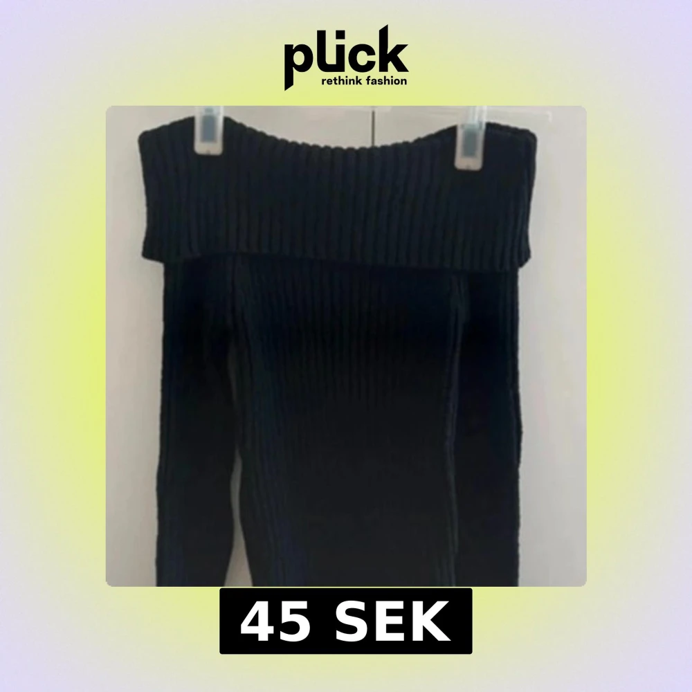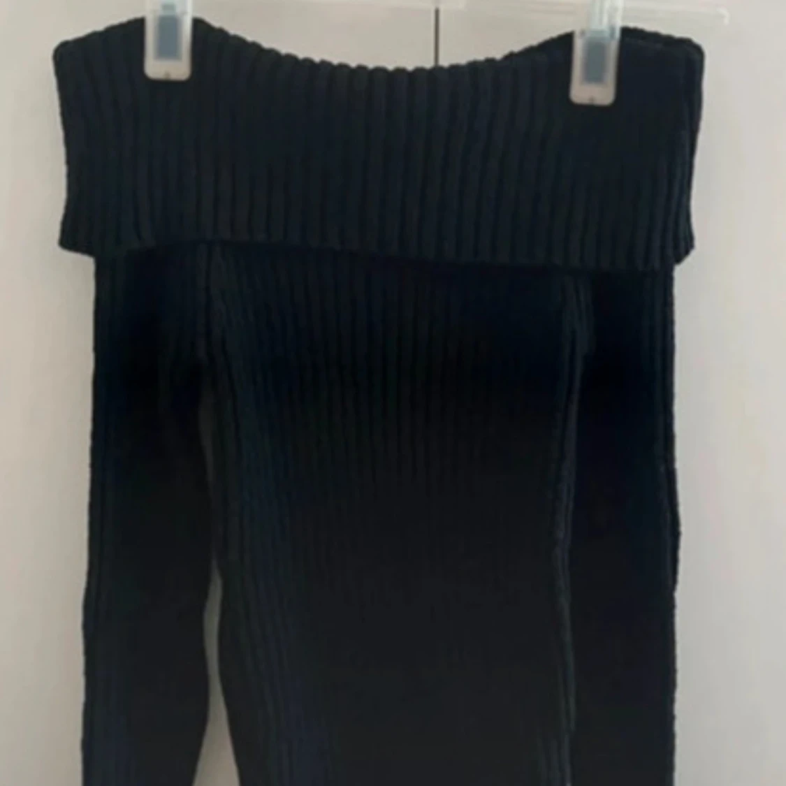 Säljer en svart stickad tröja med bred offshoulder-krage. Tröjan är ribbad och har långa ärmar, perfekt för kyligare dagar. Snygg och enkel att matcha med olika outfits.