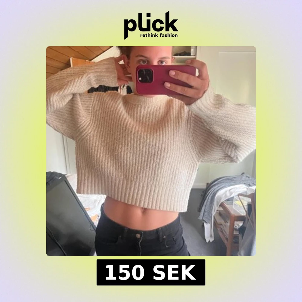 Säljer en beige croppad stickad tröja med lång ärm och bred ribbad struktur. Tröjan har en avslappnad passform och är perfekt att styla.