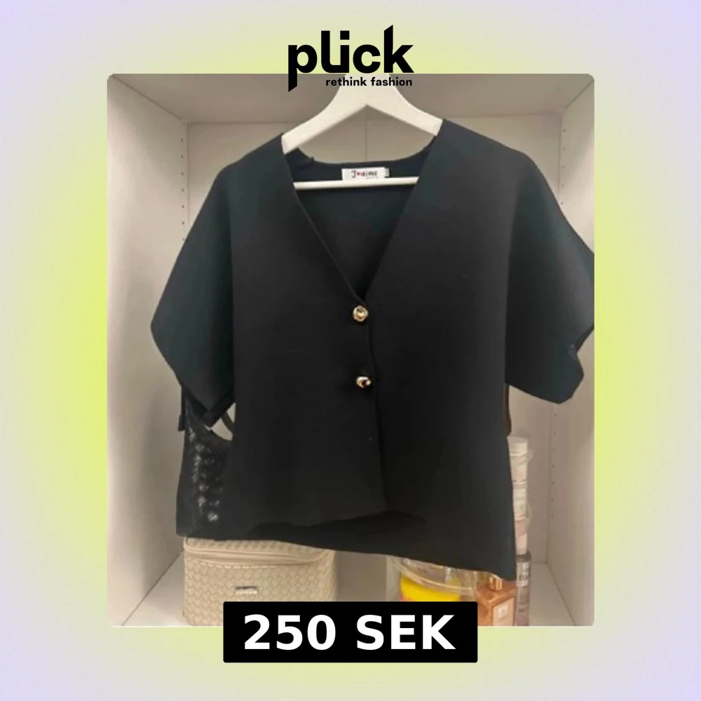 Svart blus med korta ärmar och två snygga guldfärgade knappar framtill. Blusen har en v-ringad design och är lite boxig i modellen, perfekt att styla över en t-shirt eller linne. Enkel och stilren look som funkar till många outfits.