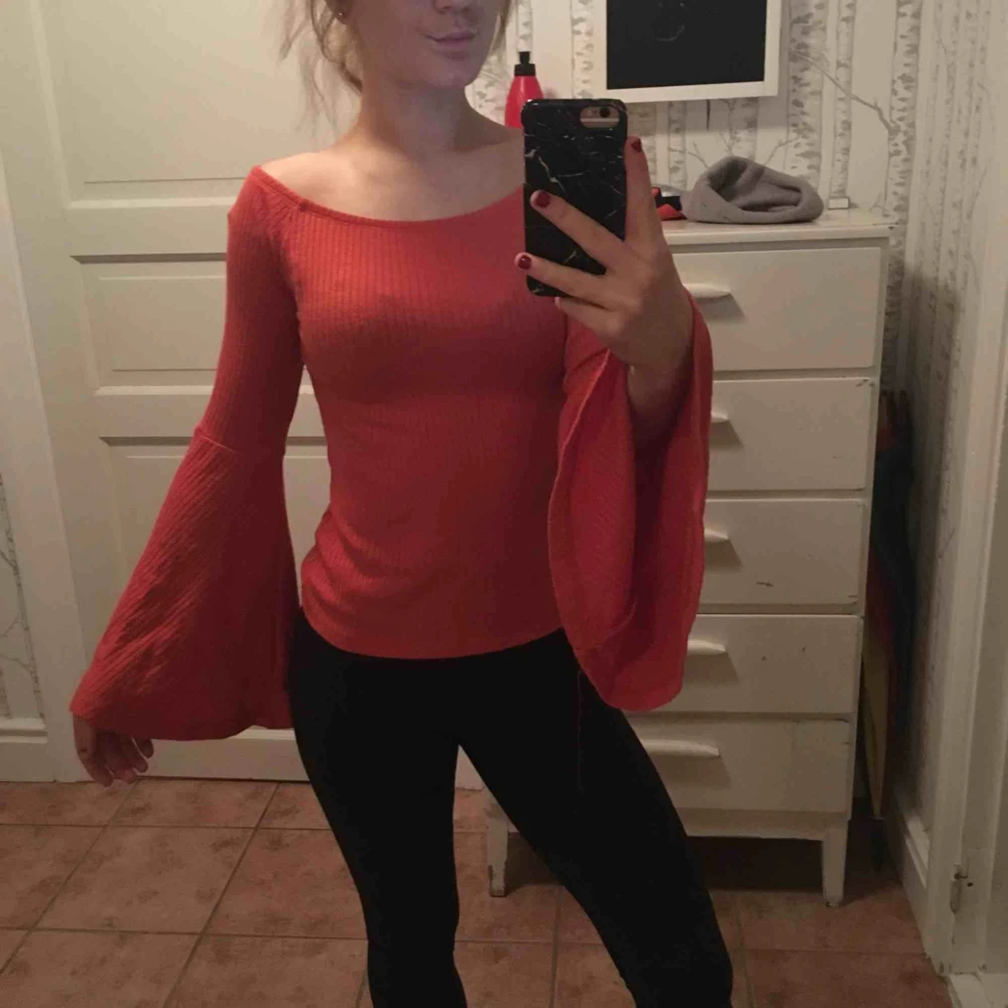 Lavaröd tröja med vida ärmar, sitter bra ner till höfterna. Tröjan är köpt på bikbok för 199 kr. Frakt igår inte i priser :)