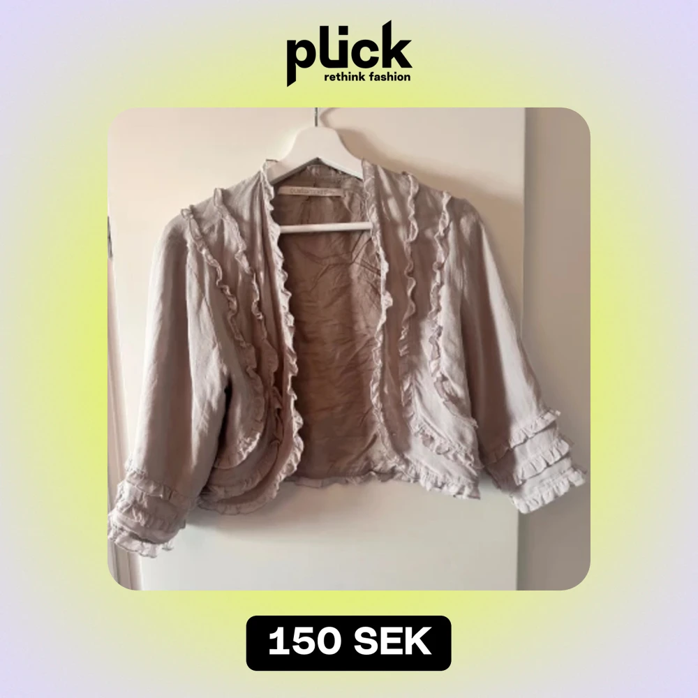 söt bolero med fina volang detaljer . Är i en beige/lila färg 💜💜 saknar ett av knäppena för att kunna knäppa koftan .