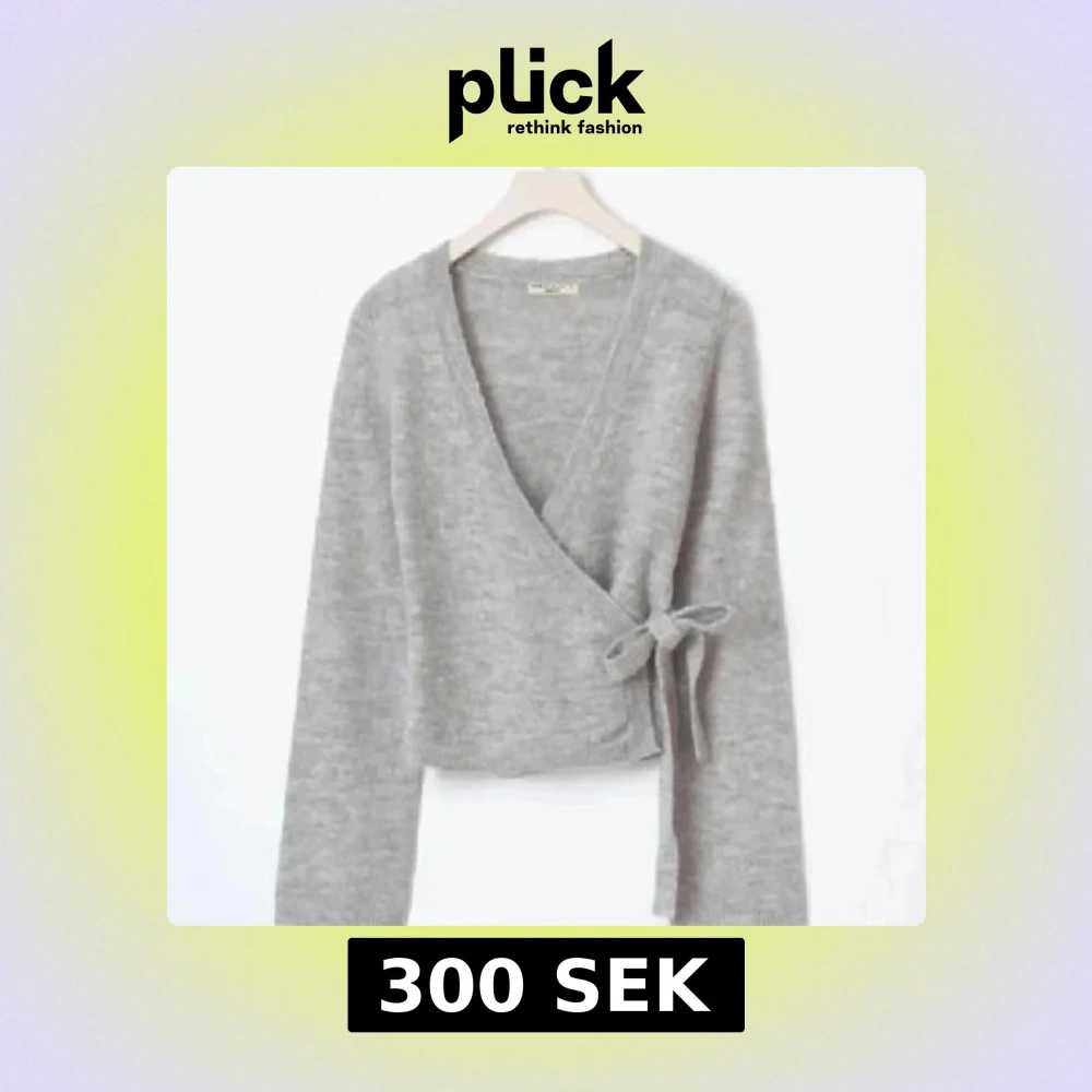 Superfin grå omlottkofta med knyt i sidan och v-ringad hals. Koftan är stickad och har långa ärmar, perfekt för lager-på-lager och chill dagar. Enkel att matcha med både jeans och kjol.