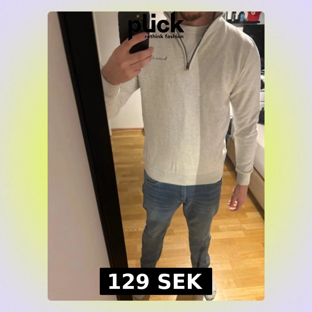 Säljer en ljusgrå tröja från Bondelid i storlek M. Tröjan har half zip-dragkedja, ribbade muddar och diskret broderad logga på bröstet. Materialet är mjukt och stickat, perfekt för lager på lager under höst och vinter.
