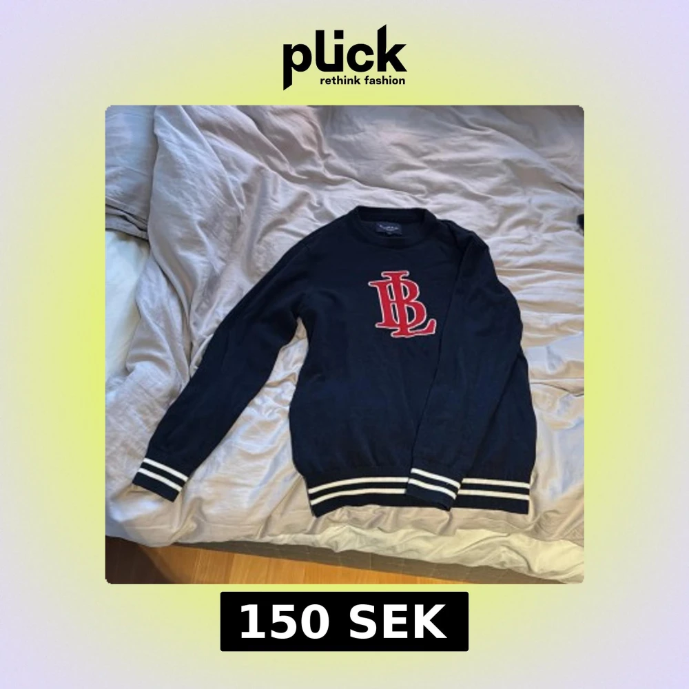 Säljer en mörkblå tröja från Bondelid med röd logotyp på bröstet. Tröjan har långa ärmar och ribbade muddar med vita ränder vid ärmslut och nederkant. Perfekt för en stilren look. Passar st. S också.
