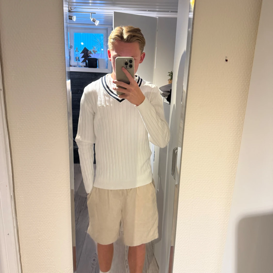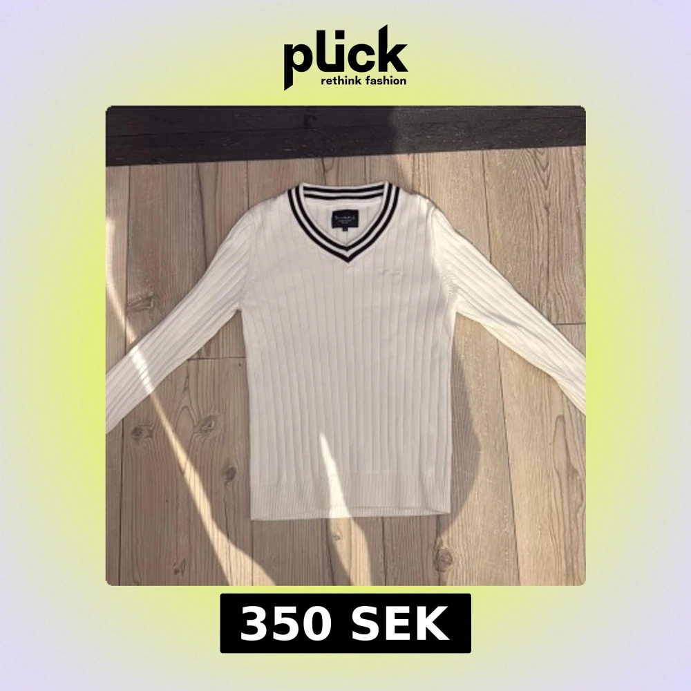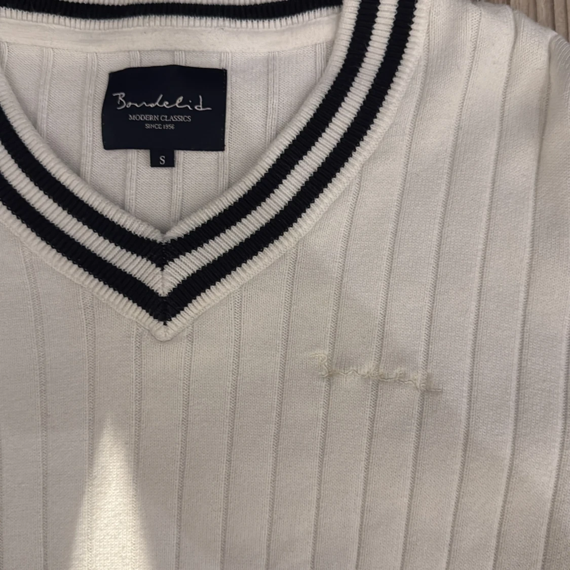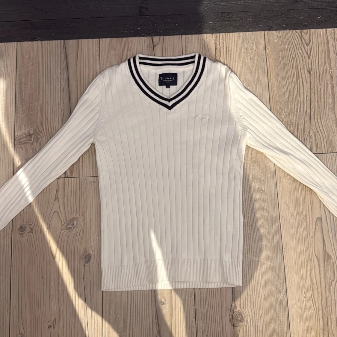Vit ribbstickad tröja från Bondelid med svart-vita ränder i v-ringad krage. Långärmad och med diskret broderad logga på bröstet. Klassisk och stilren modell som passar perfekt till jeans eller shorts.