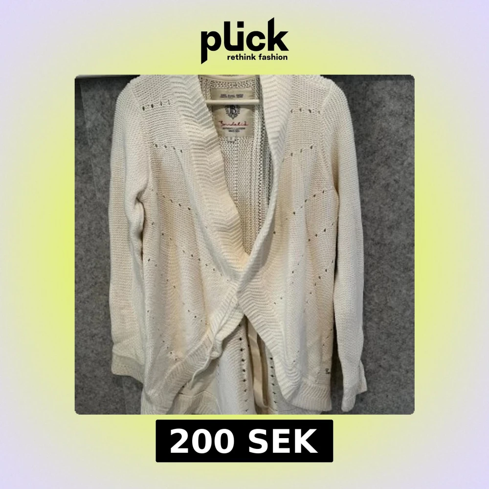 Säljer en vit stickad kofta från Bondelid med ett fint hålmönster. Koftan har långa ärmar och ett knytband i midjan för en justerbar passform. Perfekt för kyliga dagar!