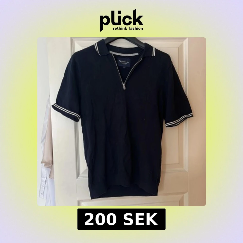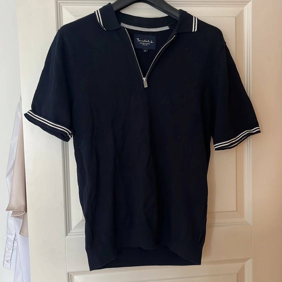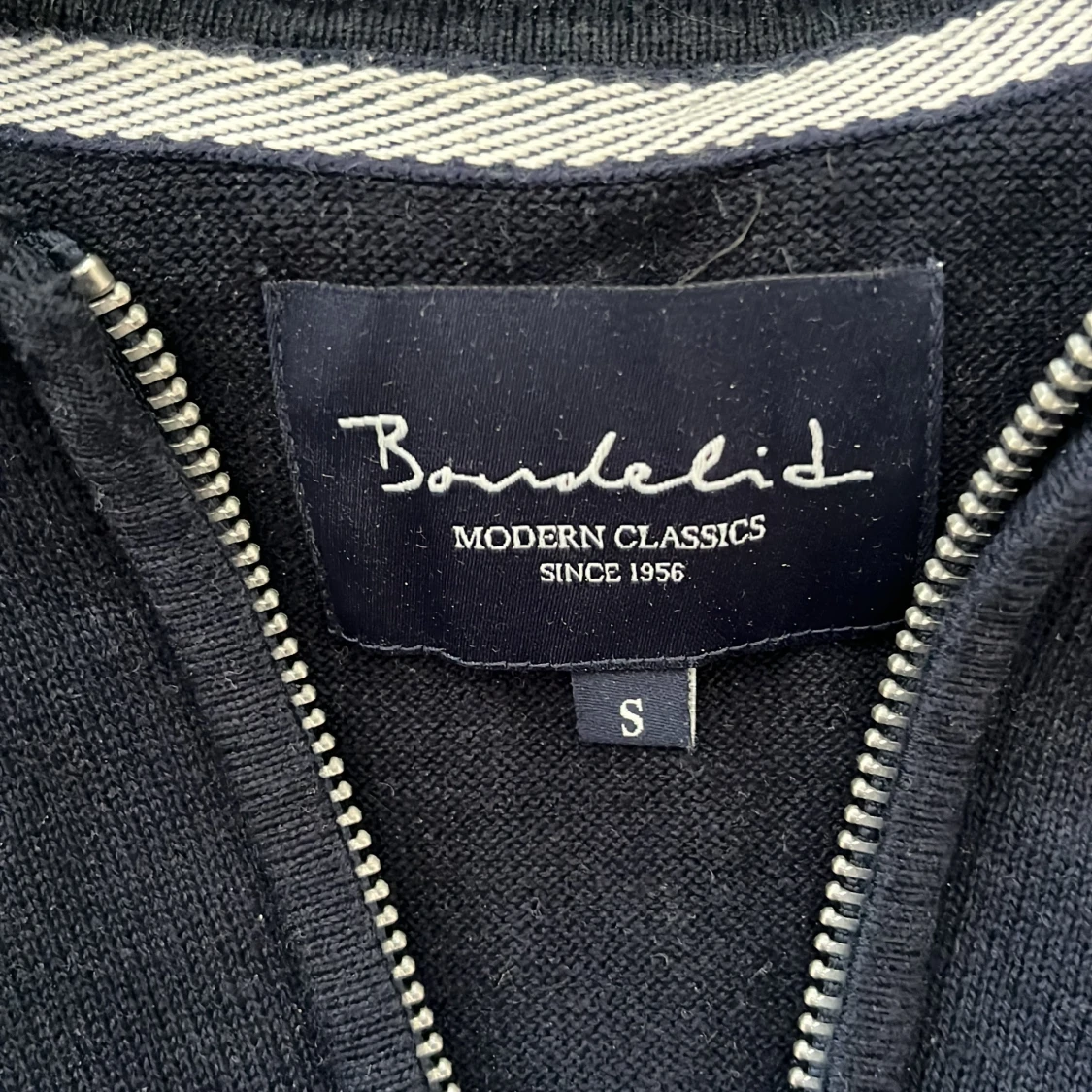 Snygg mörkblå pikétröja från Bondelid med dragkedja och vita ränder på krage och ärmslut. Perfekt för en stilren look.
