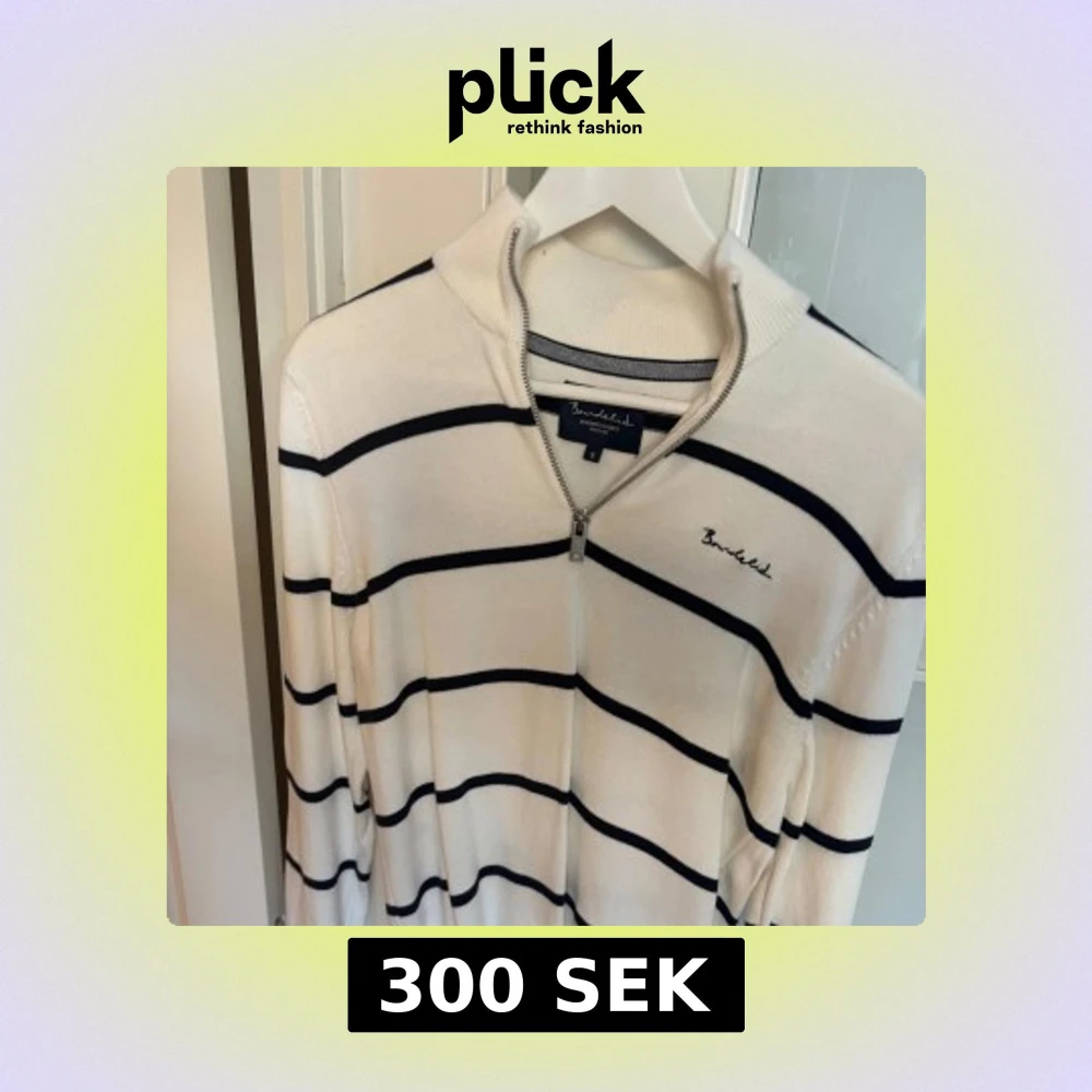 Snygg vit tröja från Bondelid med svarta horisontella ränder och half zip-dragkedja vid halsen. Tröjan har lång ärm, ribbad krage och är gjord i mjuk bomull. Perfekt för dig som gillar klassisk och stilren look.