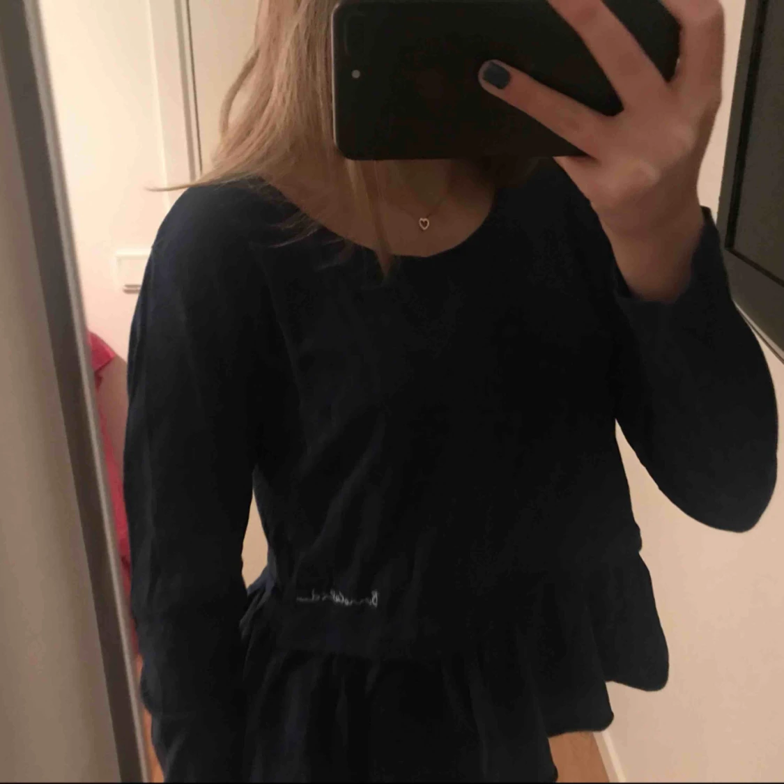 En marinblå tröja med en liten volang i slutet av tröjan.