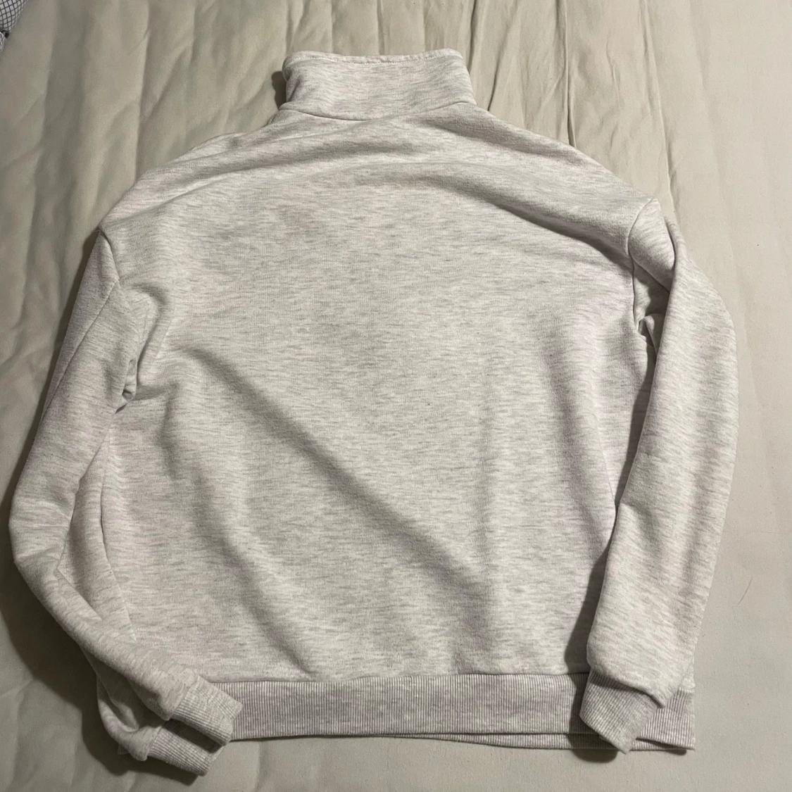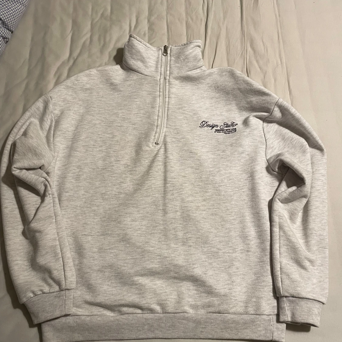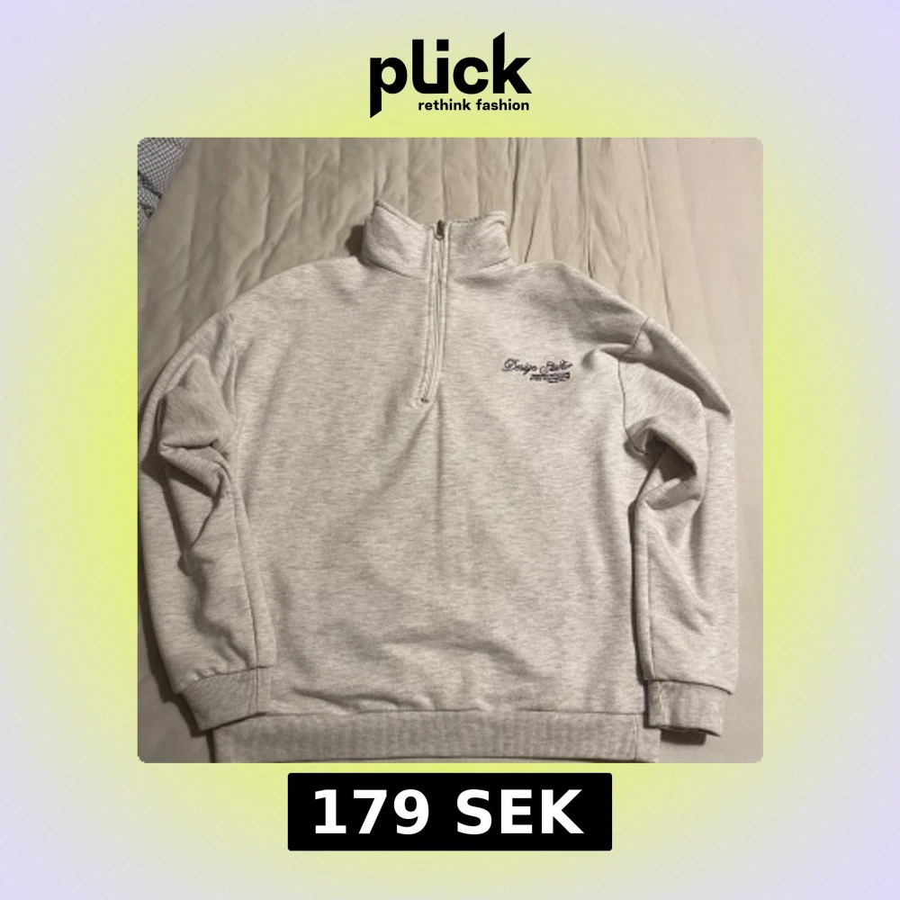 Säljer en stilren grå tröja från Boohoo med halv dragkedja och broderad text på bröstet. Tröjan har långa ärmar och ribbade muddar, perfekt för en avslappnad look. Köpt i Malmö på en Pop-up store, sparsamt använd