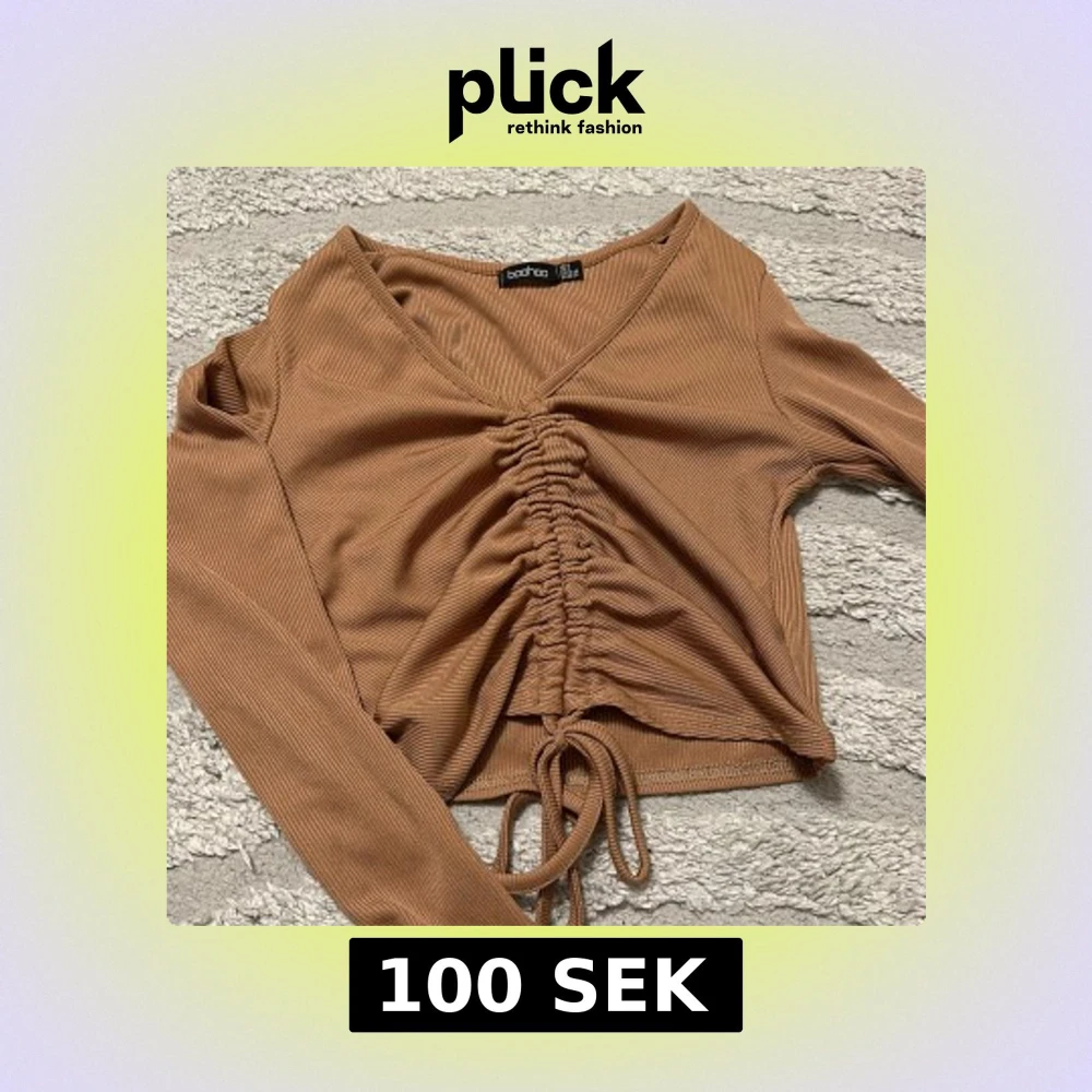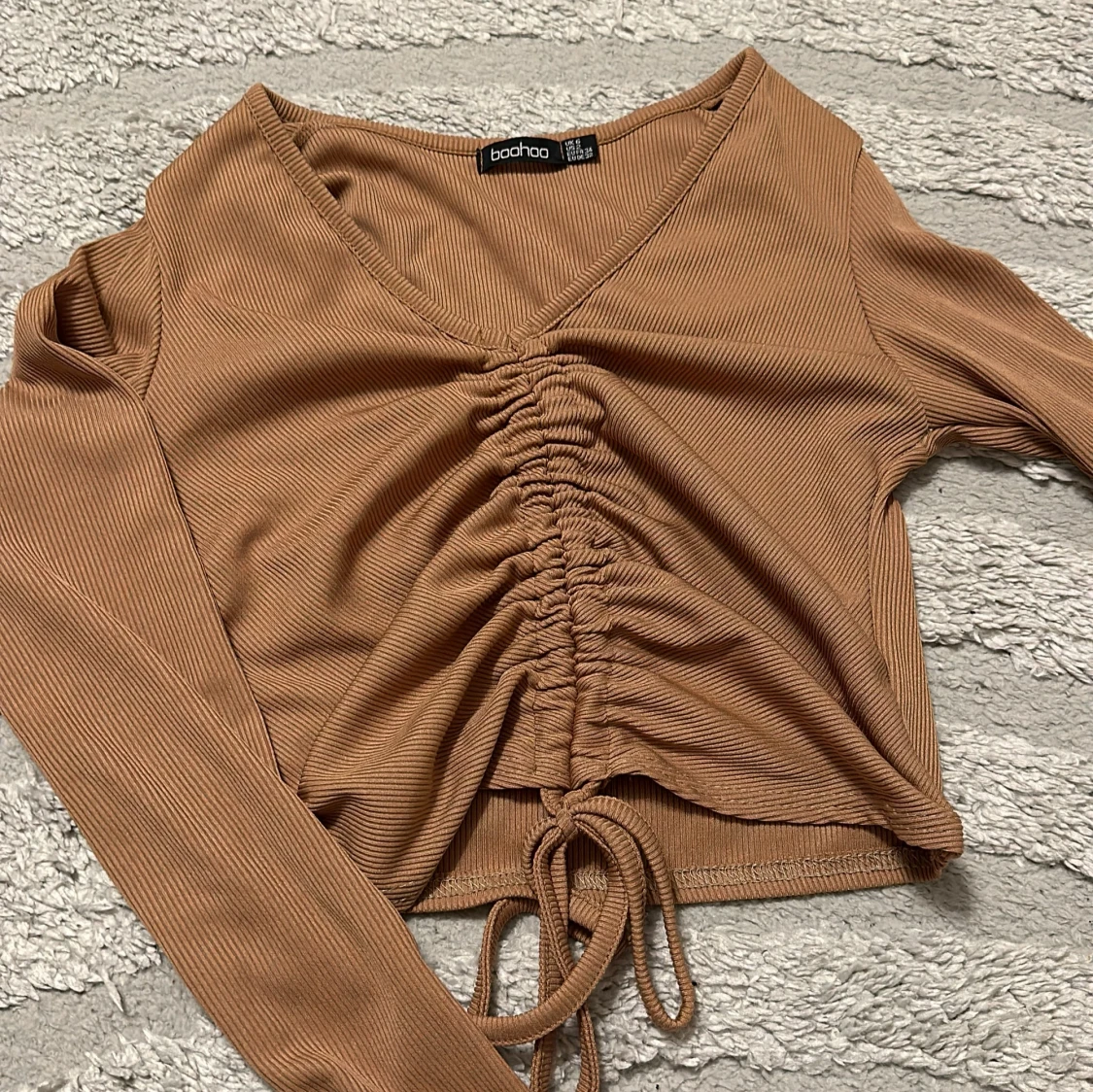 Trendig croppad topp från Boohoo i beige ribbad bomullsmix. Långärmad med v-ringning och snygg snörning framtill som ger en rynkad effekt. Perfekt för dig som gillar en stilren men ändå cool look.
