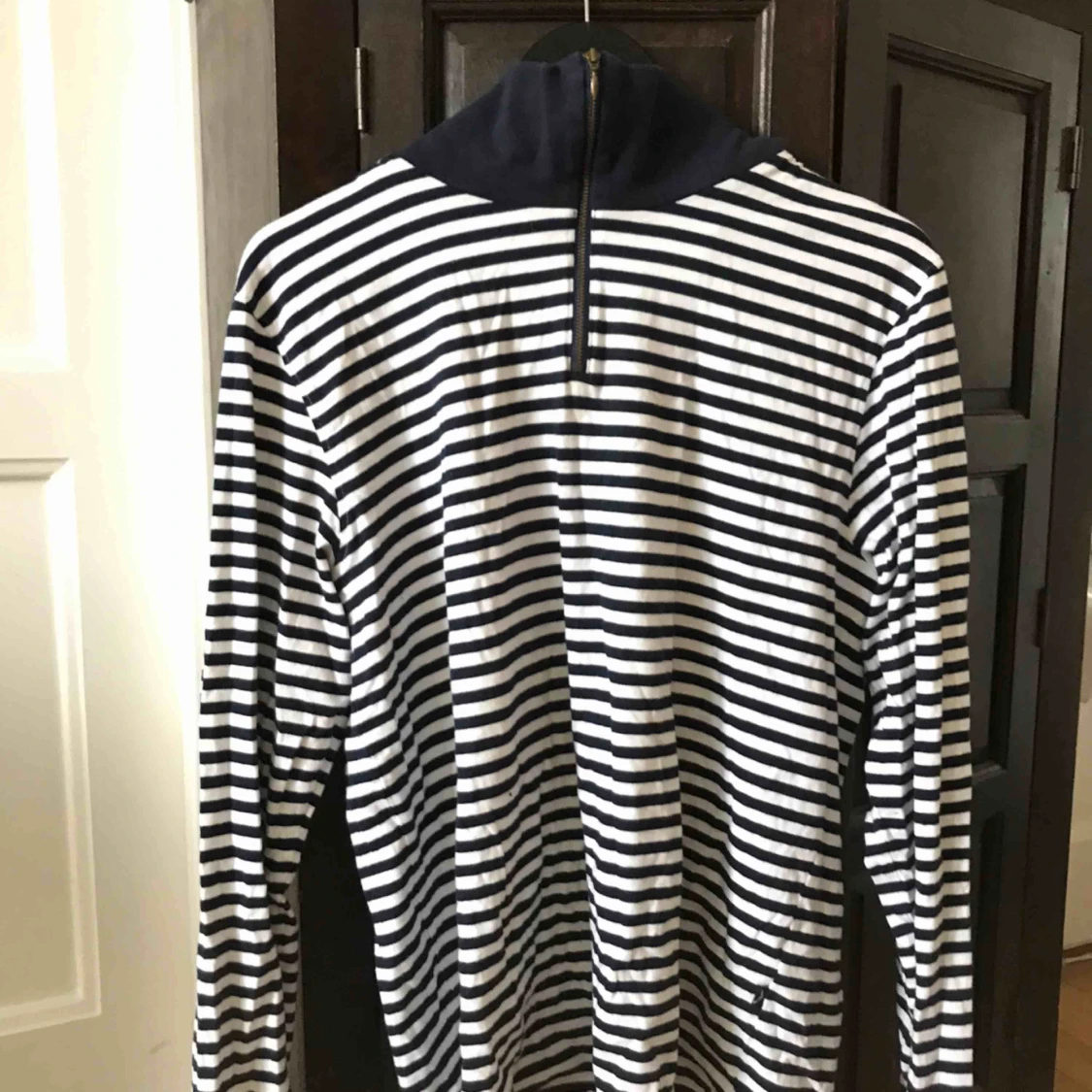 Fin blå-vit randig långärmad tröja med krage. Säljer då den inte kommer till användning längre. Köparen står för frakt. Kan även mötas upp i Stockholm