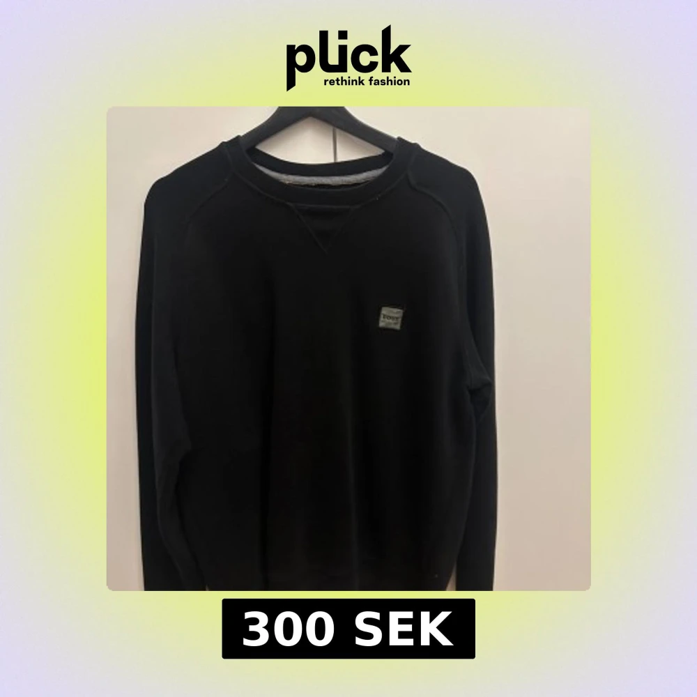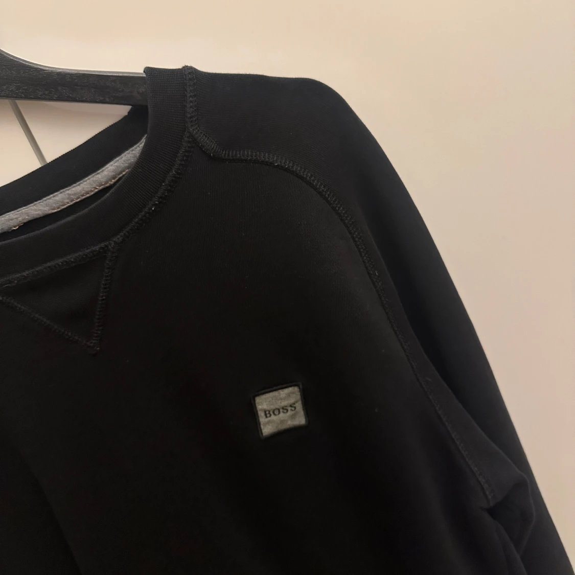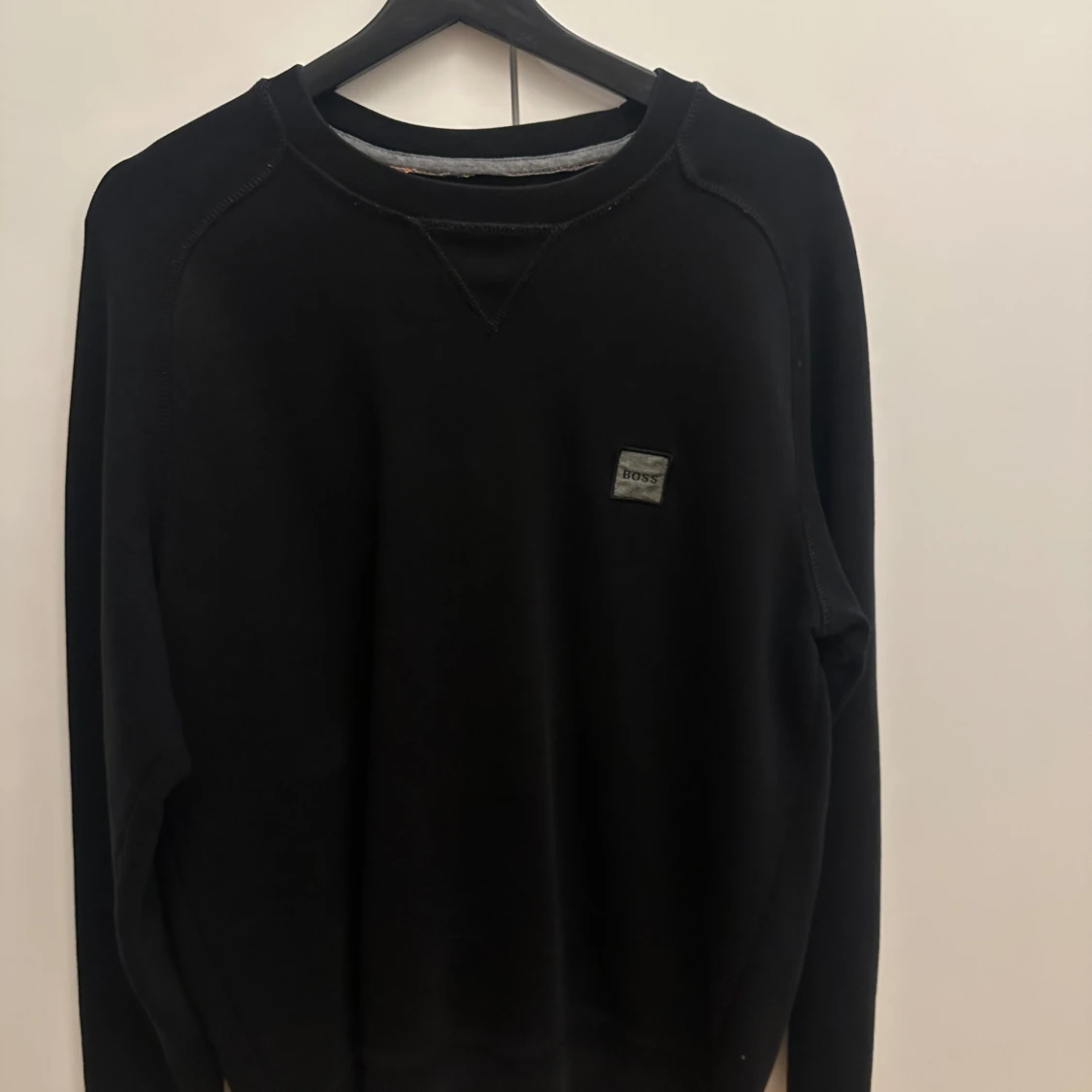 Säljer en stilren svart tröja från Boss med rund halsringning och en liten logotyp på bröstet. Tröjan har långa ärmar och är gjord i ett mjukt material.