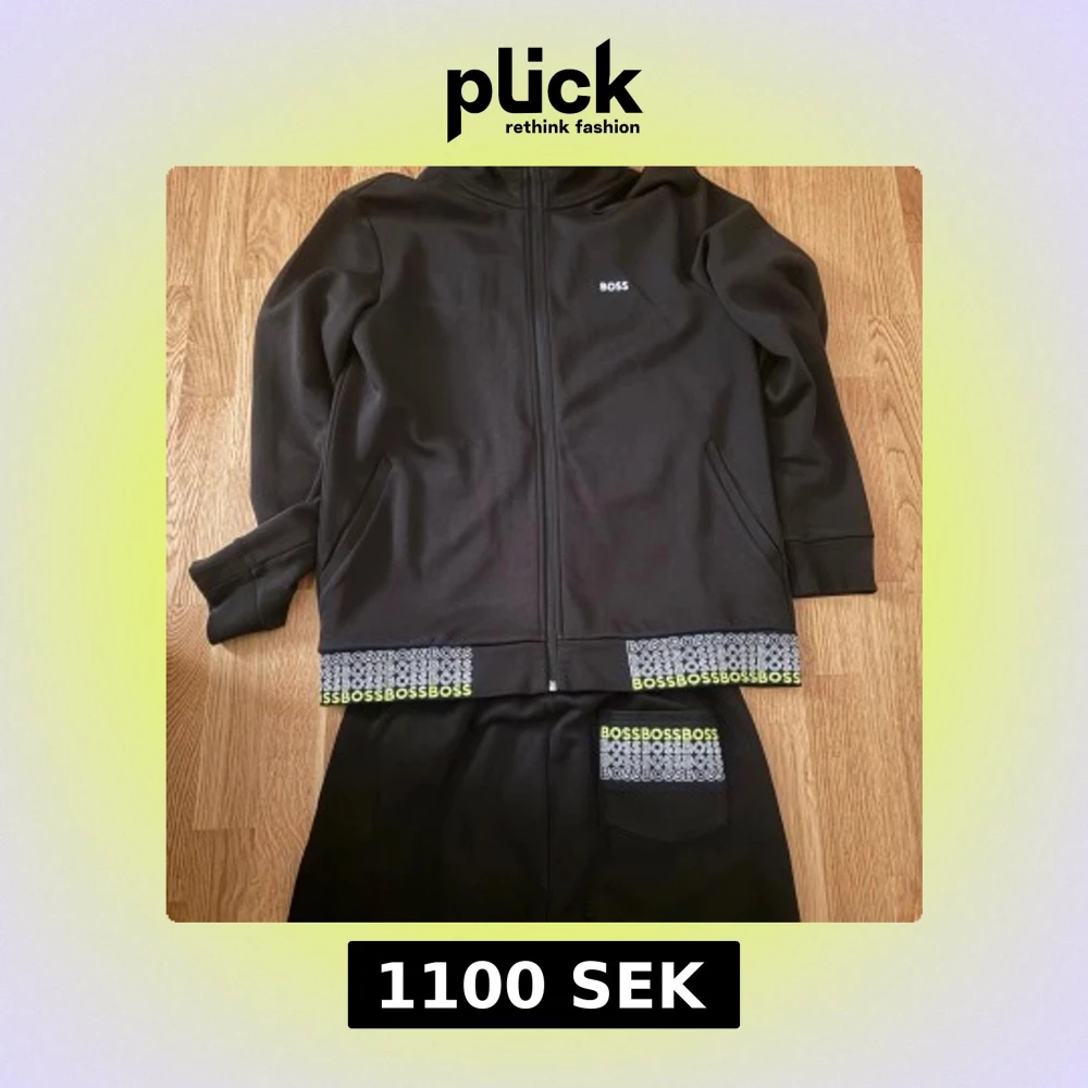 Svart tracksuit från BOSS med hel dragkedja, huva och snörning med gröna detaljer. Långärmad och med fickor på sidorna. Nederkanten har BOSS-logga i vitt och grönt. Materialet är mjukt och känns som bomull eller polyester, perfekt för chill eller träning.