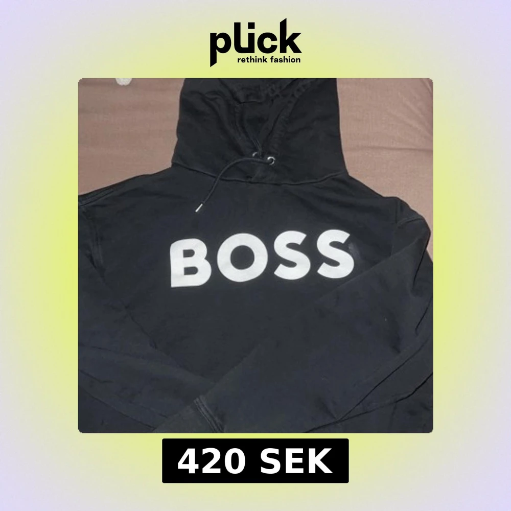 Svart hoodie från BOSS i storlek L med stor vit BOSS-logga på bröstet. Klassisk modell med huva och snörning, ribbade muddar och mjukt material. Perfekt för en chill och stilren look.