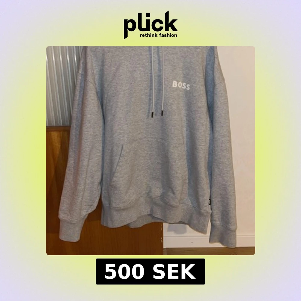 Säljer en stilren grå hoodie från BOSS med justerbar dragsko i huvan och ribbade muddar. Perfekt för en avslappnad look. BOSS-loggan är tryckt på bröstet.