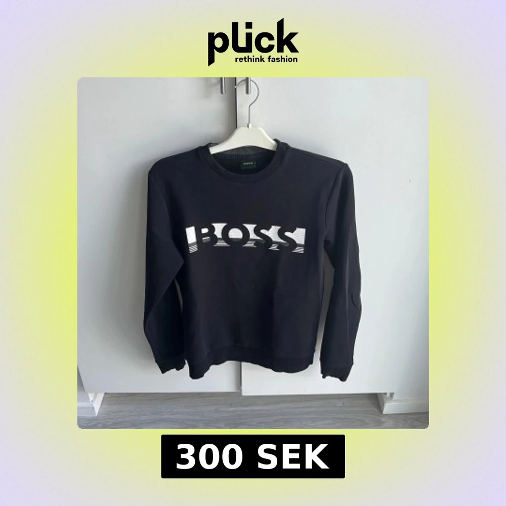 Svart sweatshirt från BOSS med stort vitt logotyptryck framtill. Klassisk rund halsringning och ribbade muddar vid ärmslut och nederkant. Skön passform och stilren design, perfekt för en clean och modern look. Köparen står för frakten!