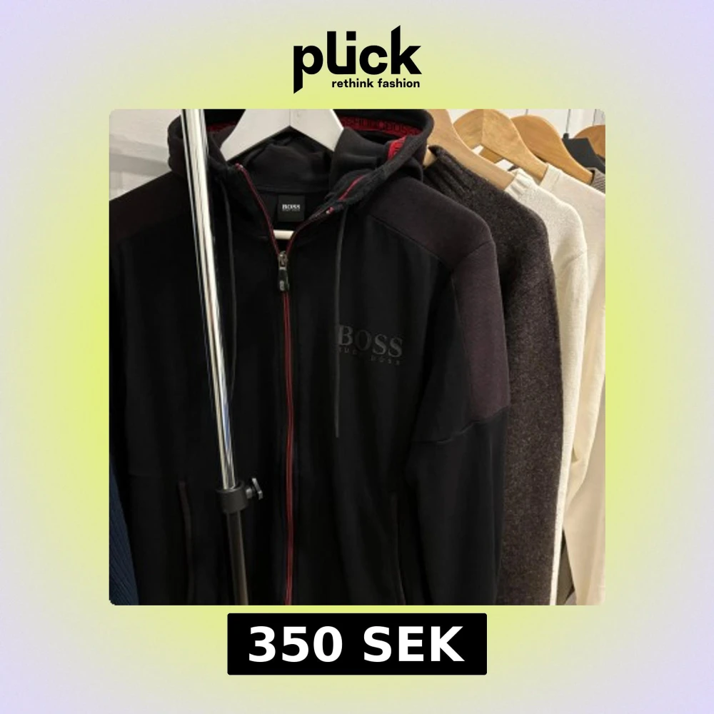 Säljer en svart hoodie från Hugo Boss med dragkedja och huva. Den har röda detaljer. Materialet har sprättats på vissa ställen som underkanter vid ärmarna samt vid ärmen (se sista bild). Nypris: 1499kr