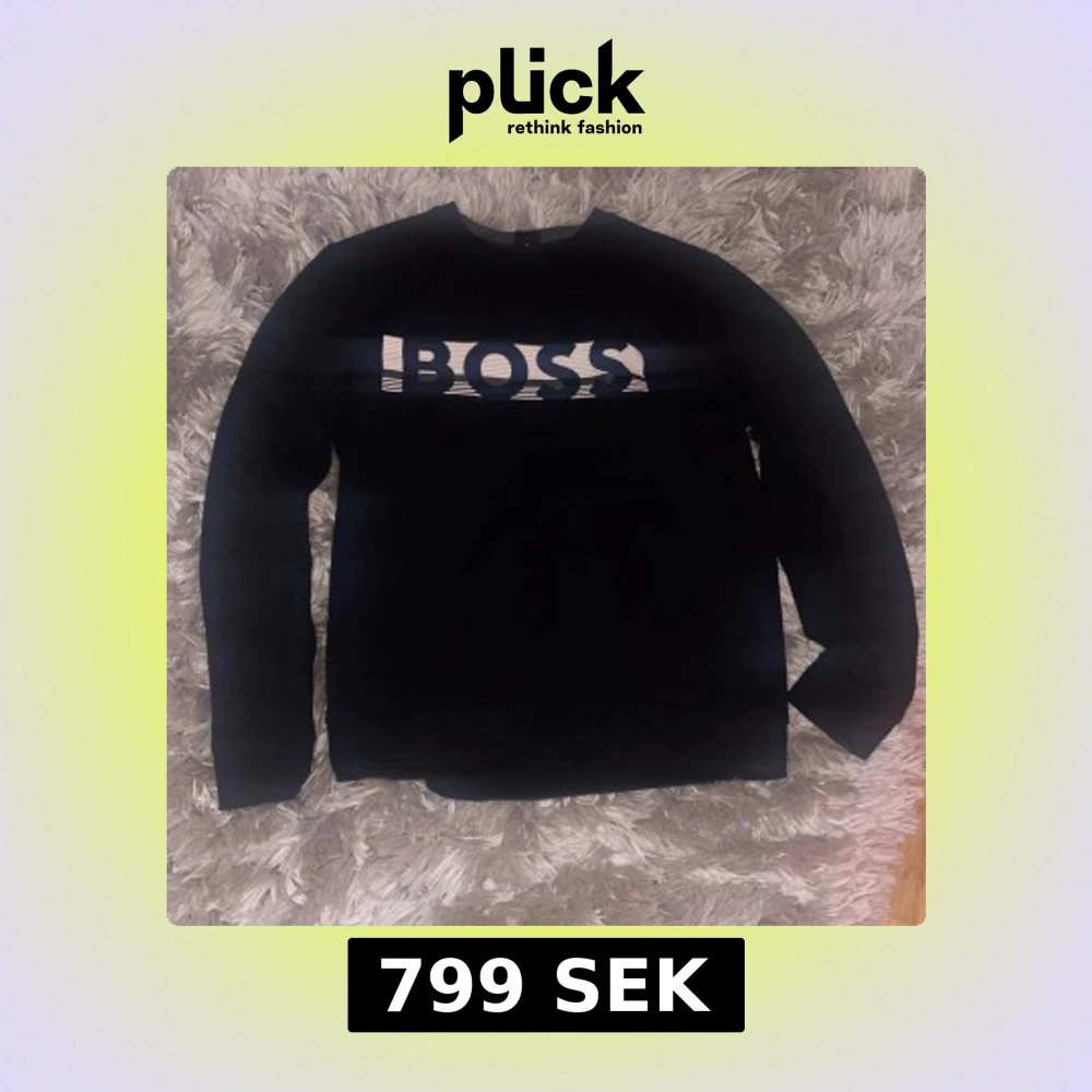 Svart sweatshirt från BOSS i storlek M med stort vitt BOSS-tryck över bröstet. Tröjan har rund hals, långa ärmar och ribbade muddar. Tillverkad i mjuk bomull för en skön och avslappnad stil.