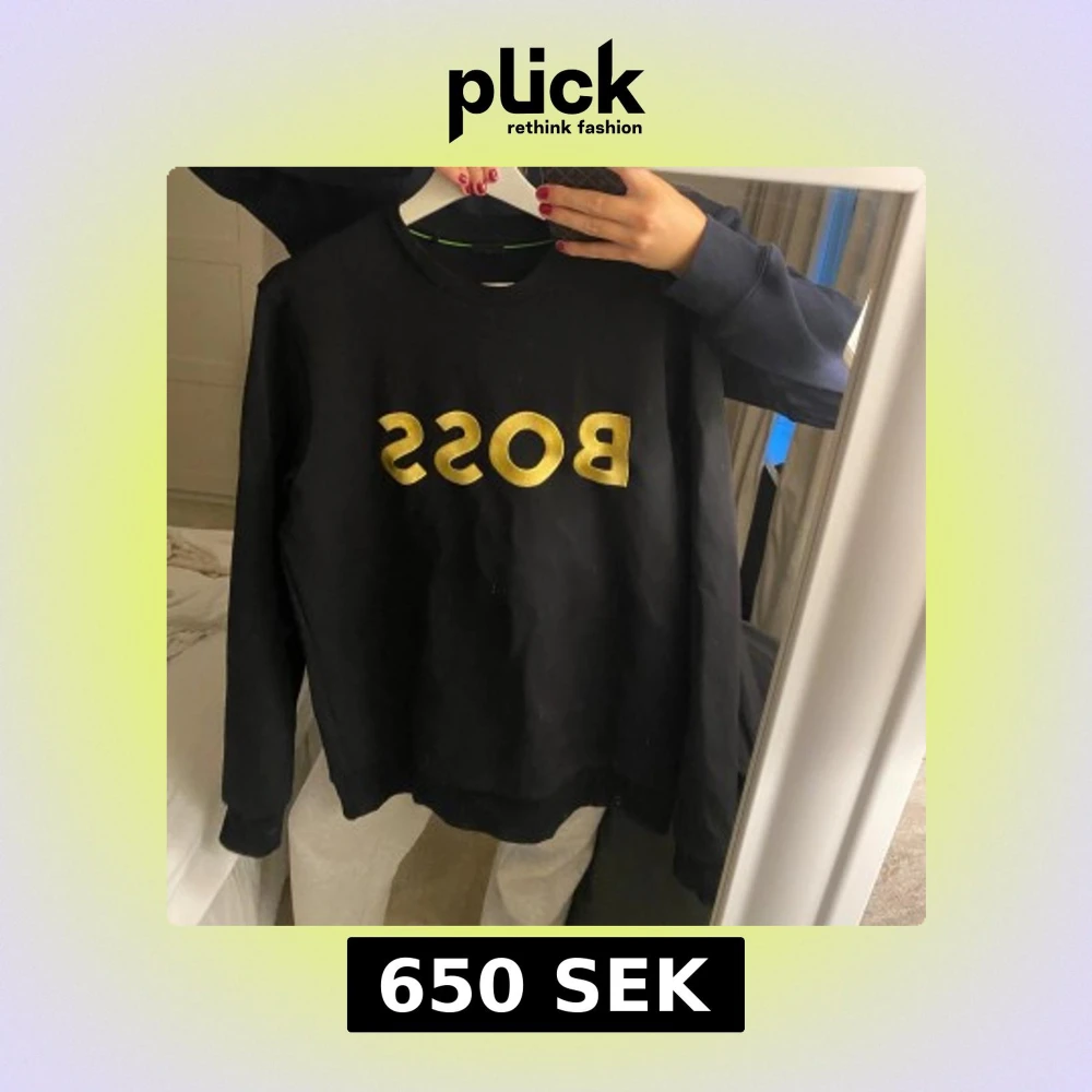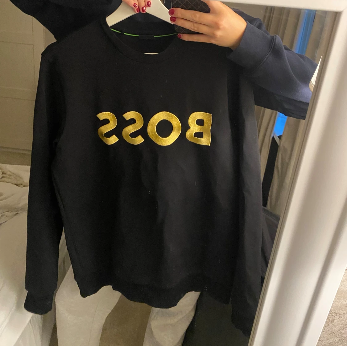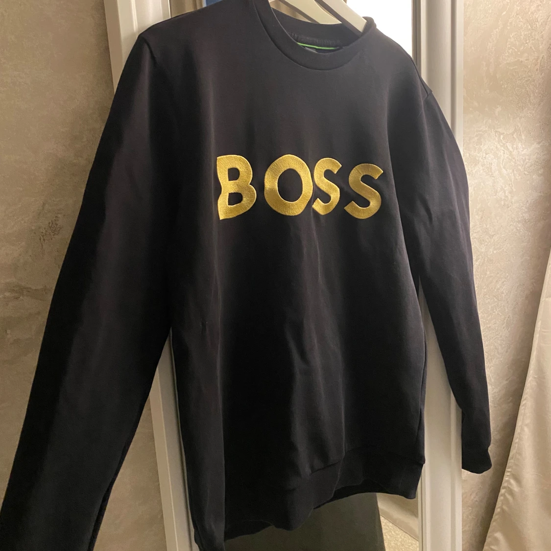 Svart sweatshirt från BOSS med stort, glansigt guldtryck på bröstet. Klassisk rund halsringning och långa ärmar. Tillverkad i mjuk bomull som är skön att ha på sig. Perfekt för dig som vill sticka ut med en clean och lyxig look.