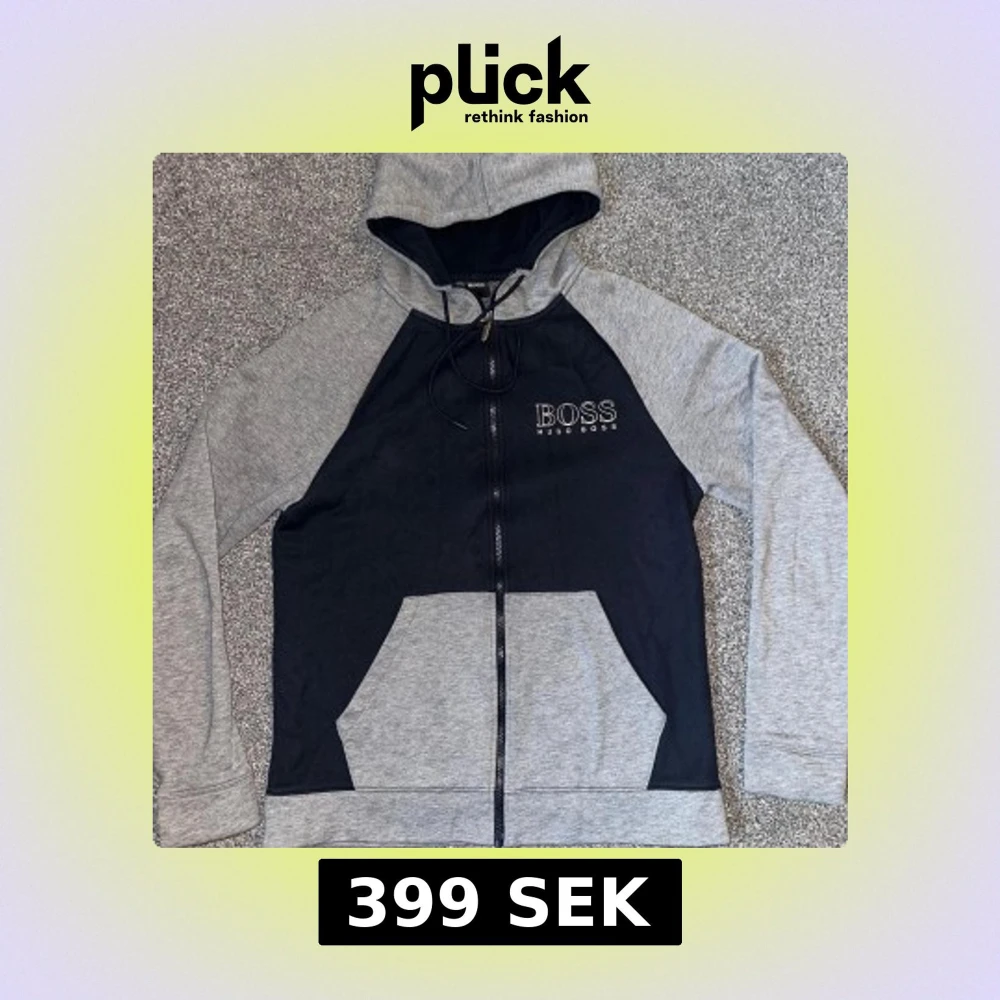 Snygg grå och navy hoodie från Boss med dragkedja och huva. Tröjan har långa ärmar och ett stilrent tryck på bröstet. Perfekt för en avslappnad stil. Köpt för 1500kr