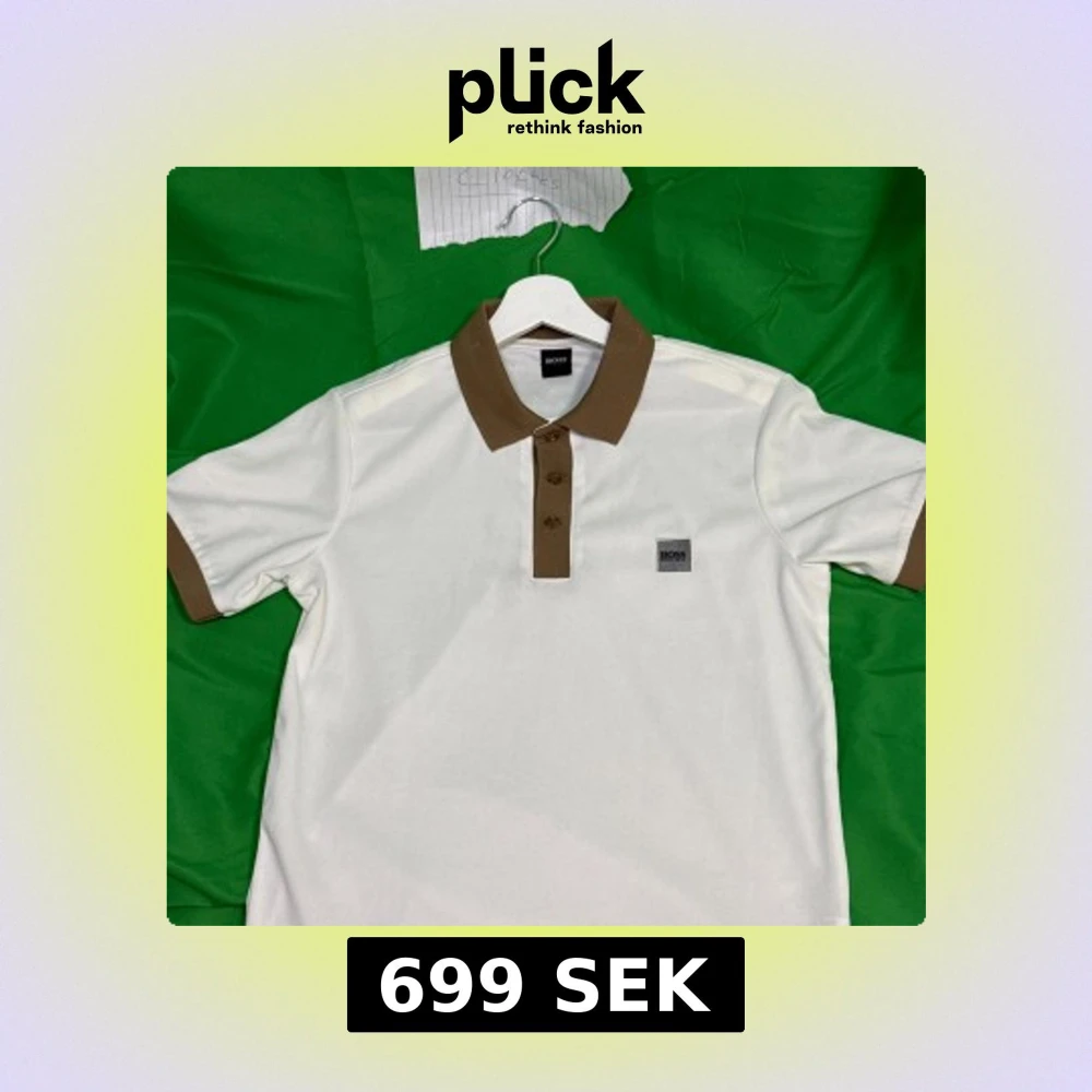Snygg vit pikétröja BOSS med bruna detaljer på krage, ärmslut och knappslå. Klassisk passform med korta ärmar och diskret BOSS-logga på bröstet. Perfekt för en clean och stilren look.Liknande modell som originalet!