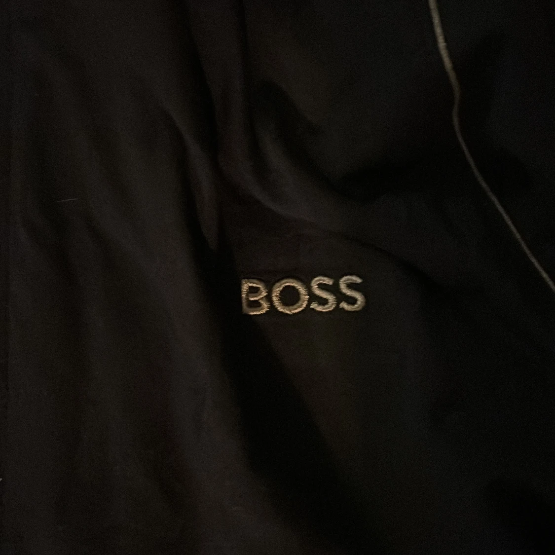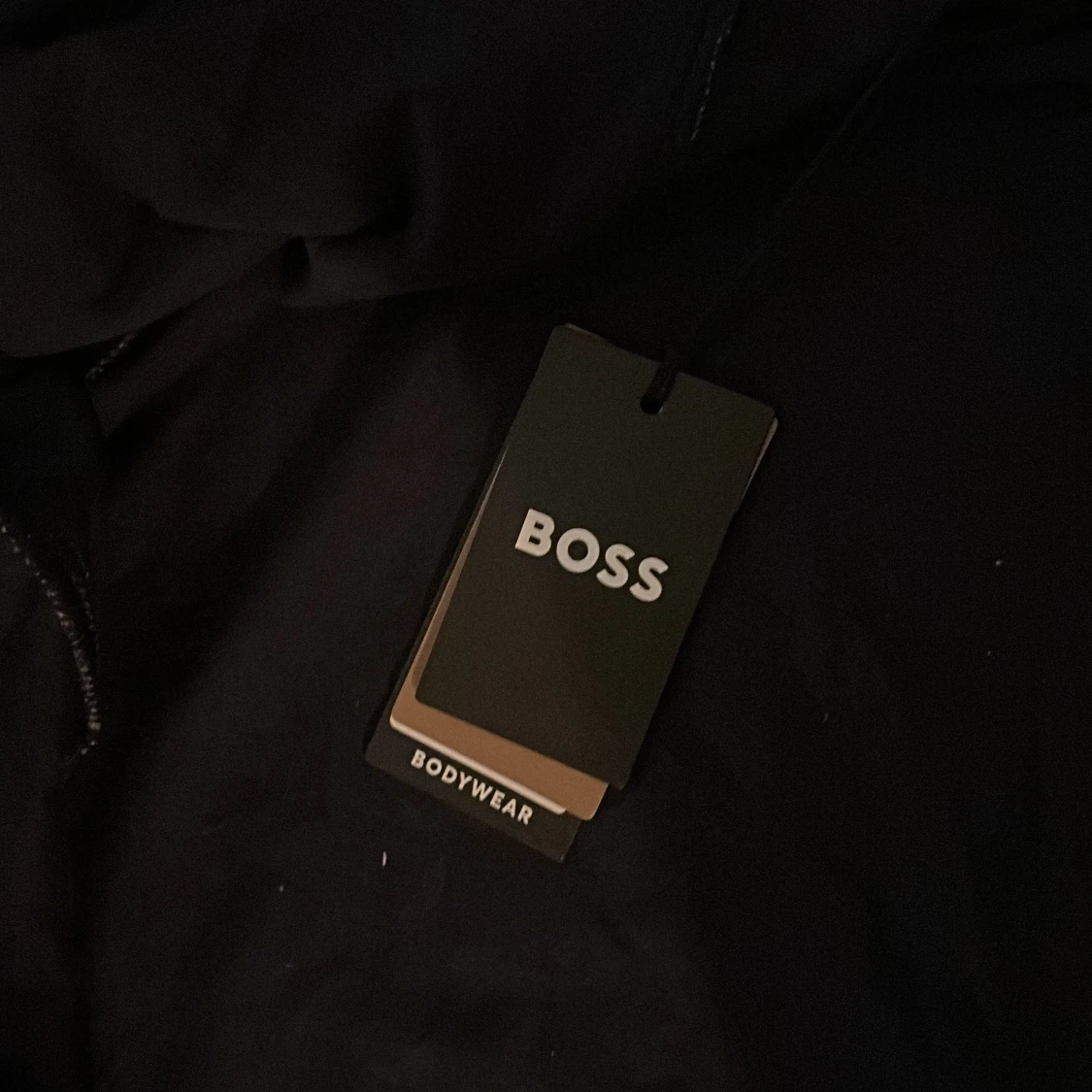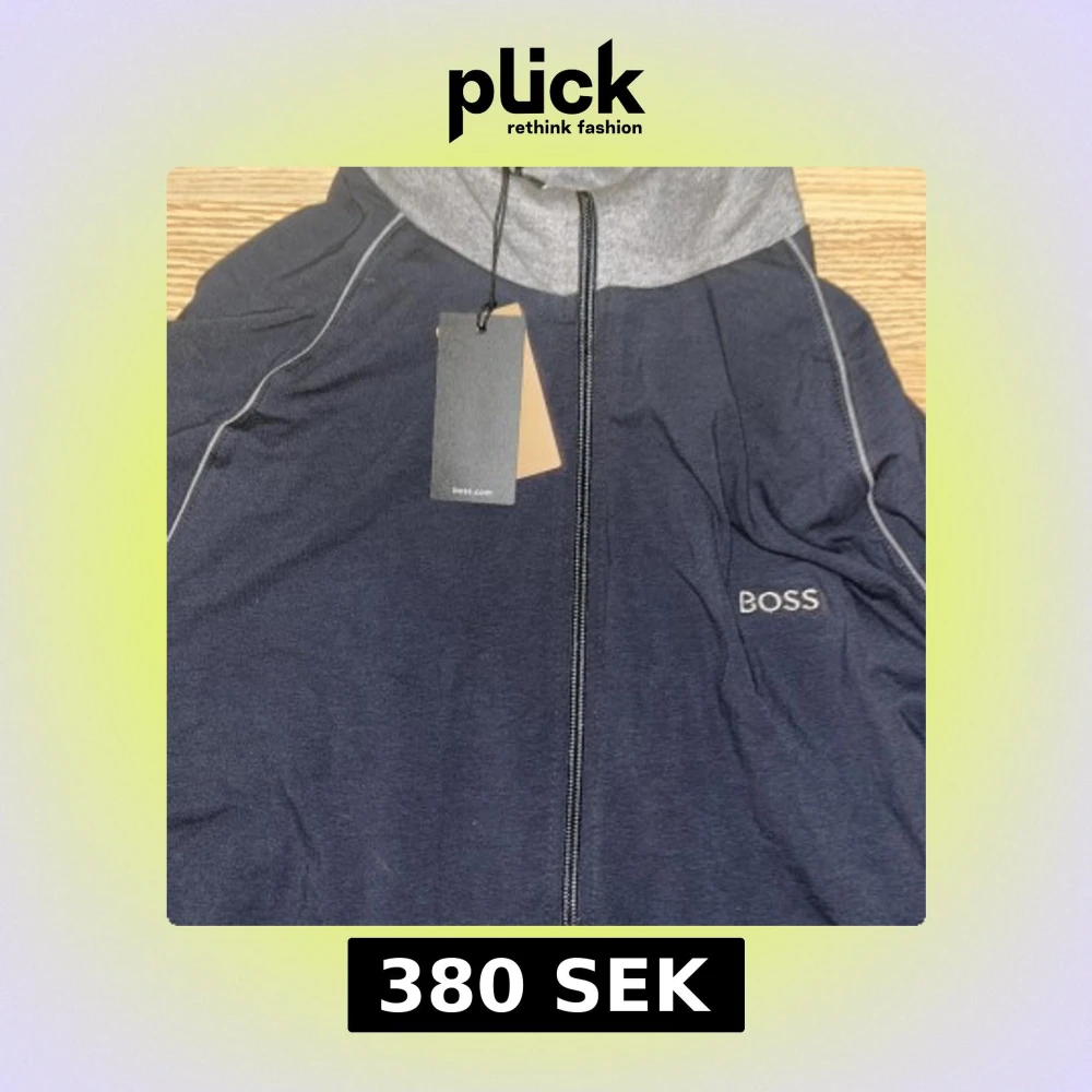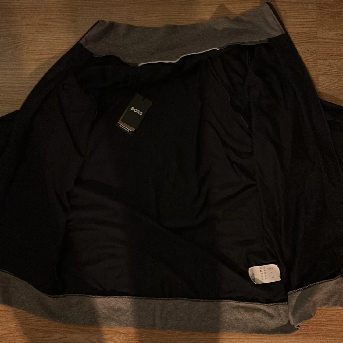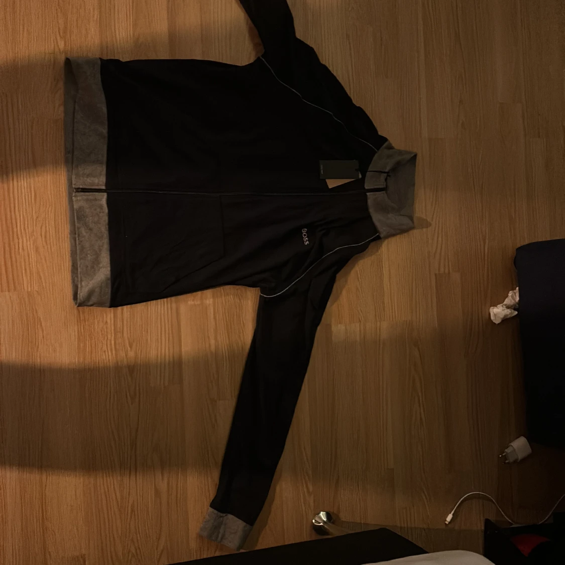 Snygg navy blue och grå kofta från BOSS med broderad logga på bröstet. Koftan har hel dragkedja, höga muddar och krage i kontrasterande grått. Perfekt för en clean och sportig look. Materialet är mjukt och känns skönt mot huden.