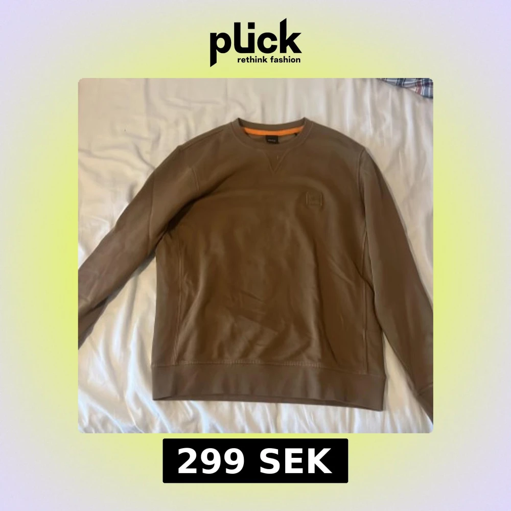 Säljer en stilren beige sweatshirt från BOSS med rund halsringning och diskret logopatch på bröstet. Tröjan har långa ärmar och ribbade muddar vid ärmslut och nederkant. Perfekt för en clean och avslappnad look.