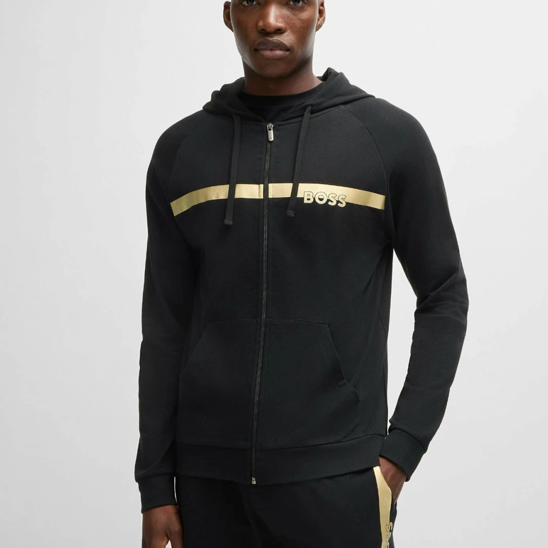 Svart hoodie från BOSS med dragkedja, huva och snörning. Snygg guldfärgad rand över bröstet och BOSS-logga i guld. Mjuk bomullsblandning och känguruficka framtill. Perfekt för en chill och stilren look.