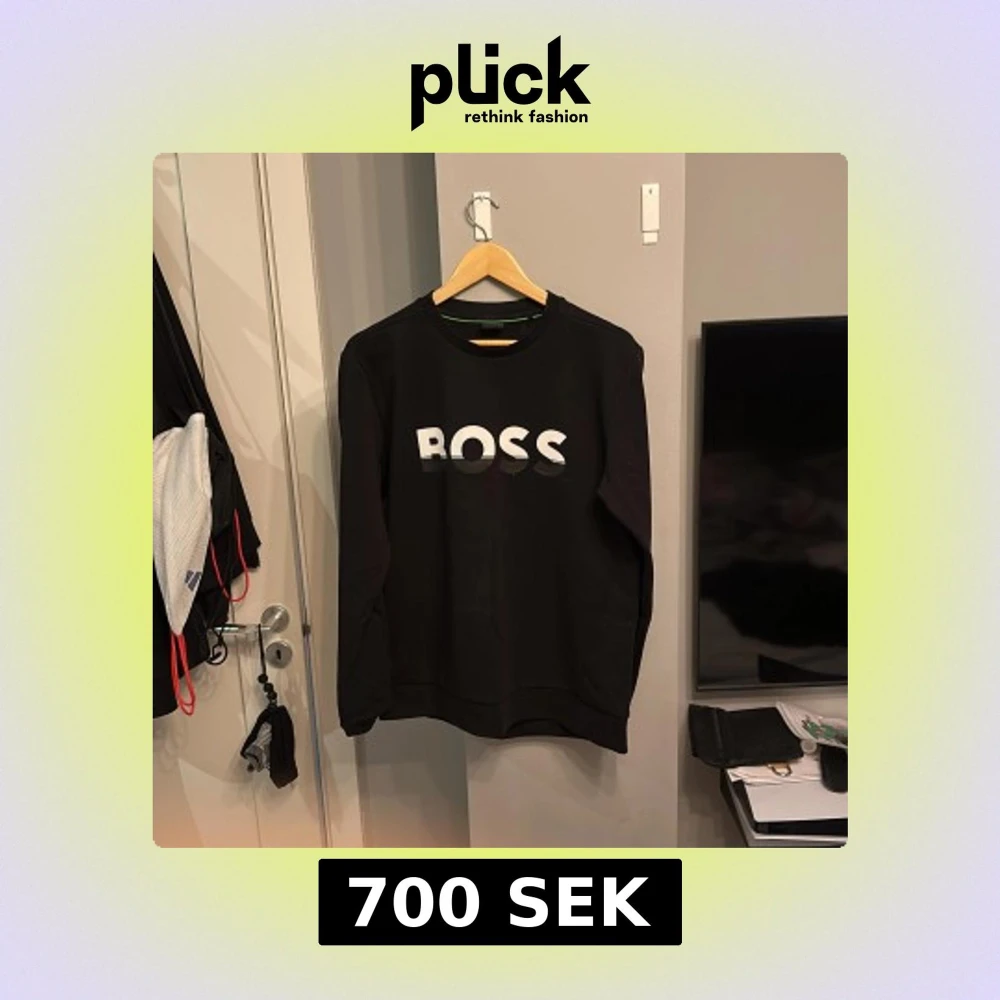 Snygg svart sweatshirt från Boss med deras logga i vitt och grått på bröstet. Tröjan har långa ärmar och en klassisk rund halsringning. Perfekt för en stilren och avslappnad look.