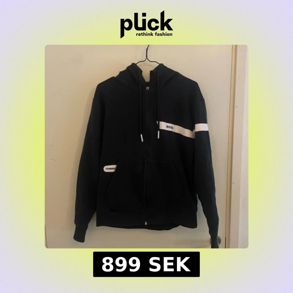 Svart hoodie från BOSS med vit rand över bröstet och ärmen samt BOSS-logga. Tröjan har dragkedja, huva med snörning och känguruficka framtill. Tillverkad i mjuk bomull, perfekt för chill dagar. Snygg och enkel att matcha med jeans eller joggers. Storlek S