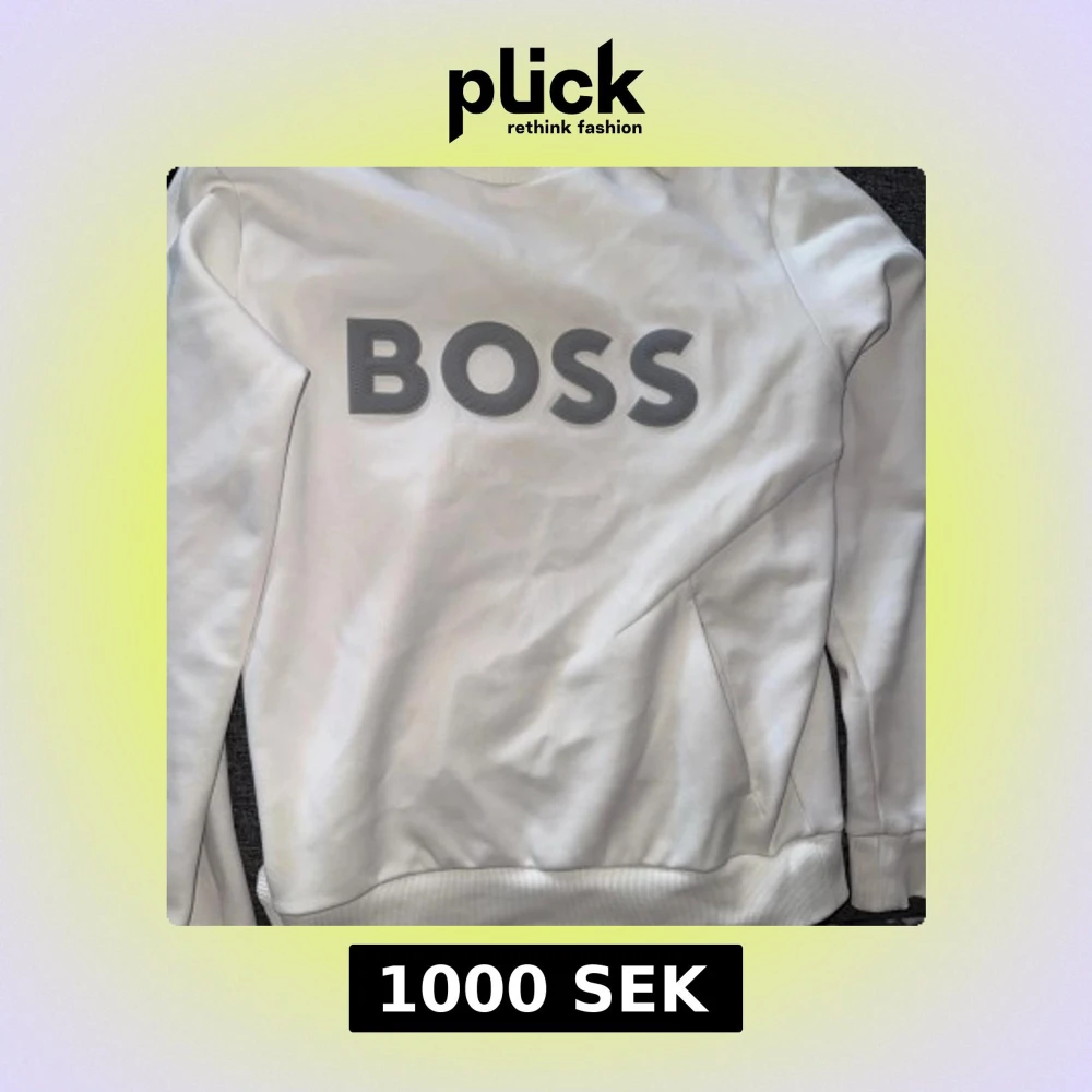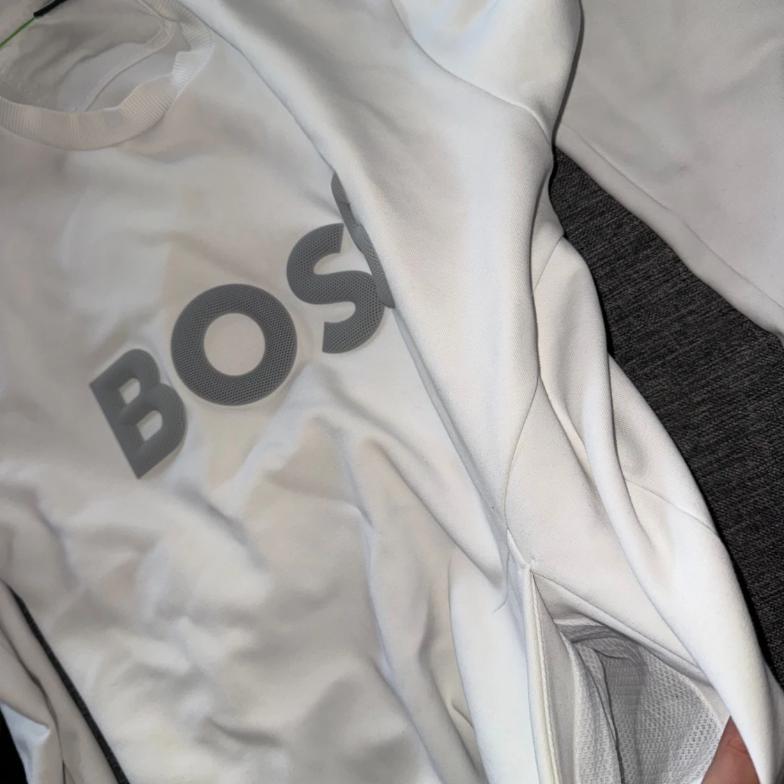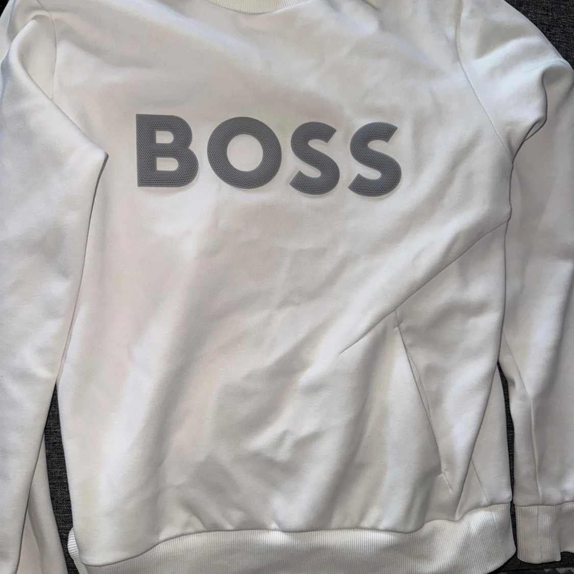 Snygg vit sweatshirt från BOSS med stor grå 3D-logga framtill. Tröjan har oxå en ficka vid magen, använd ca 10 gånger. Köpt för 1800