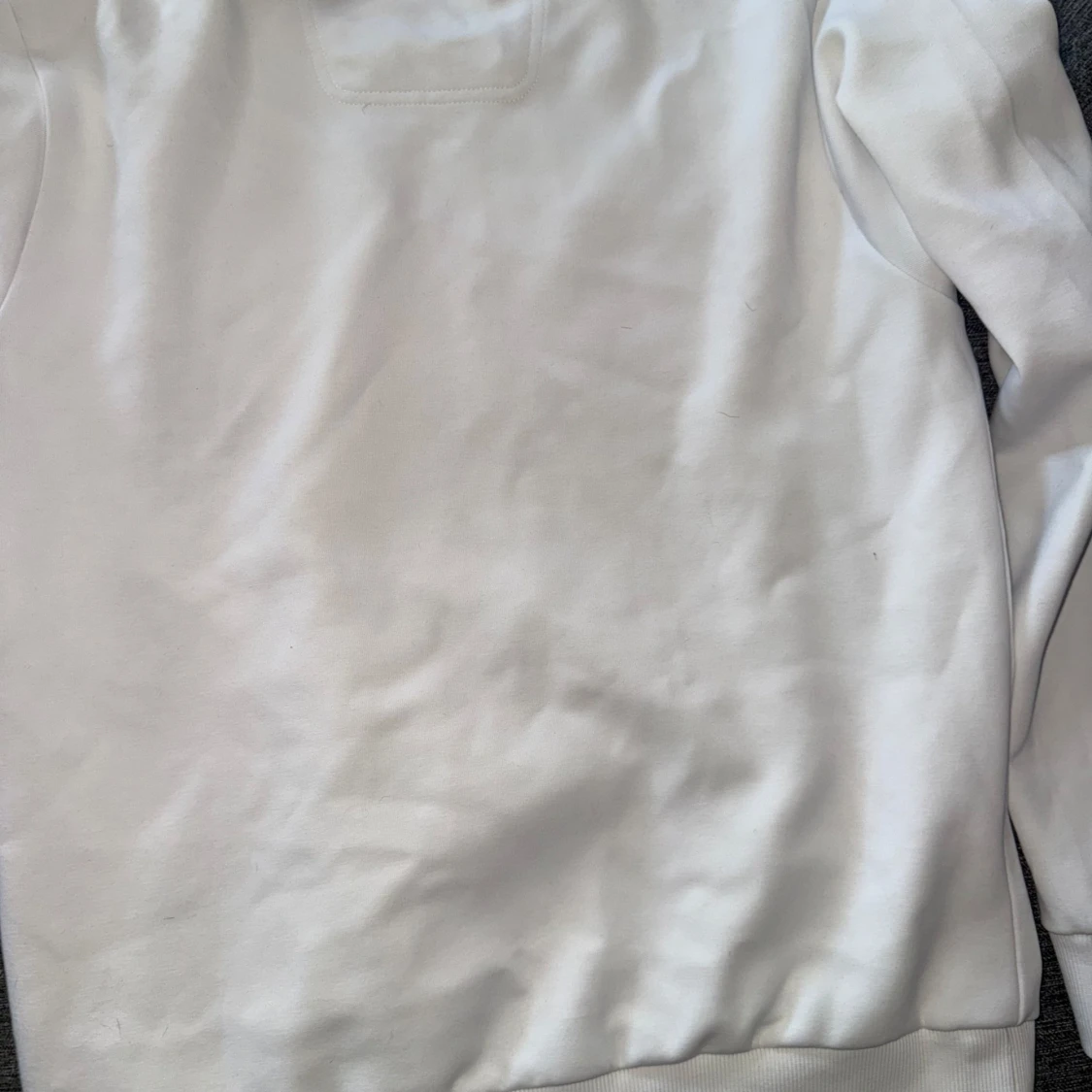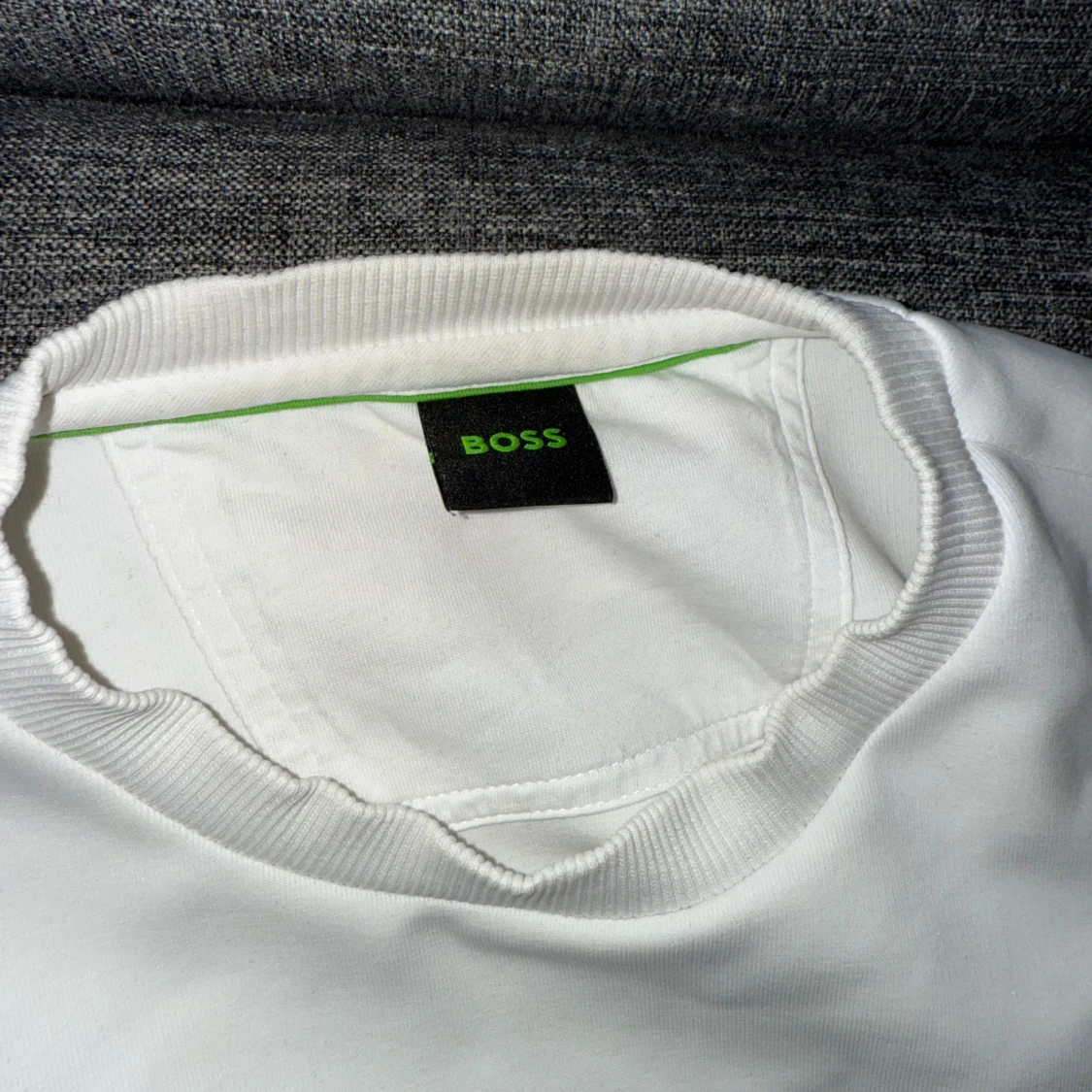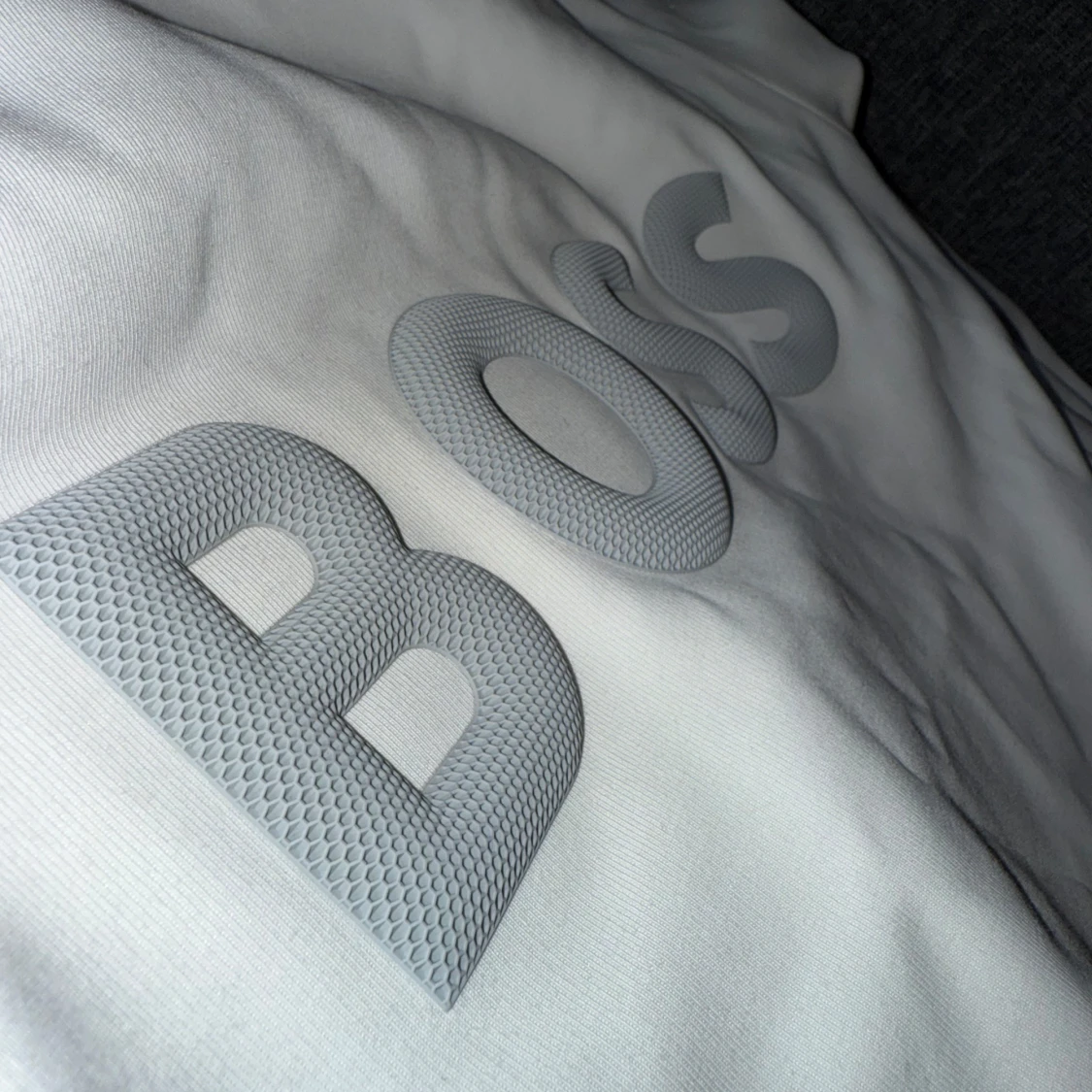 Snygg vit sweatshirt från BOSS med stor grå 3D-logga framtill. Tröjan har oxå en ficka vid magen, använd ca 10 gånger. Köpt för 1800