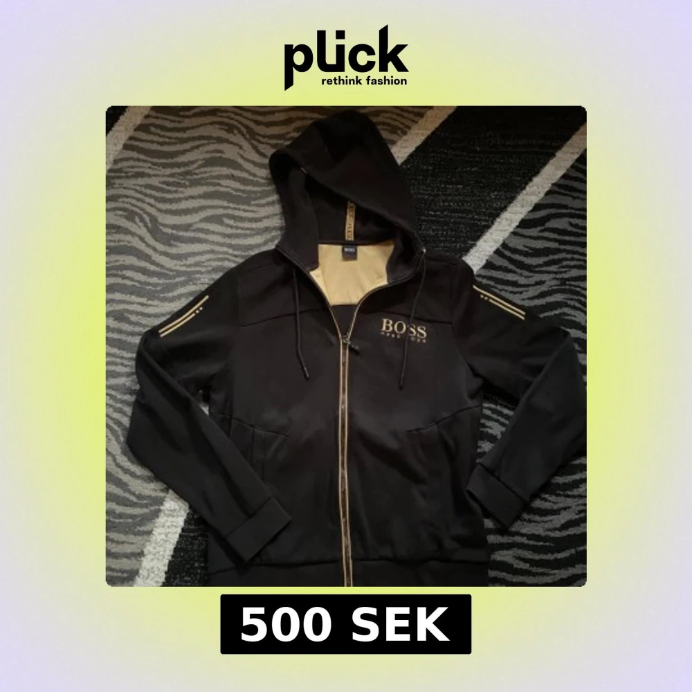 Svart hoodie från BOSS med guldfärgade detaljer och dragkedja. Stort BOSS-tryck på bröstet, huva med snörning och guldiga ränder på ärmarna. Insidan av huvan är beige. Perfekt för en stilren och sportig look. Priset kan diskuteras.