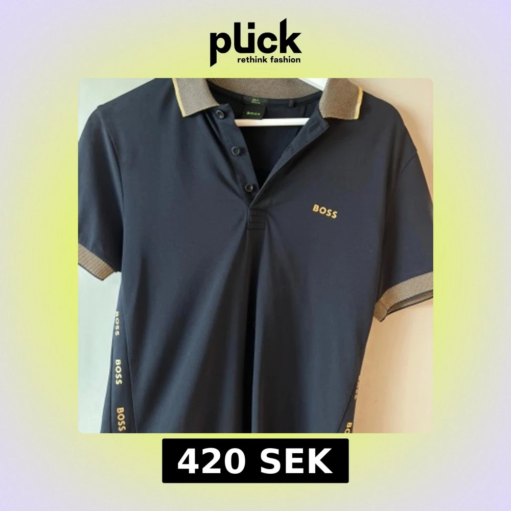 Svart pikétröja från BOSS med guldfärgade detaljer och logga på bröstet och ärmarna. Tröjan har klassisk krage i kontrasterande beige/guld, korta ärmar och knäppning framtill. Slim fit-modell i stretchigt material som sitter snyggt på kroppen. STRL S-Passar för de som pendlar mellan S & M i strl! Använd endast en gång!👌🏼