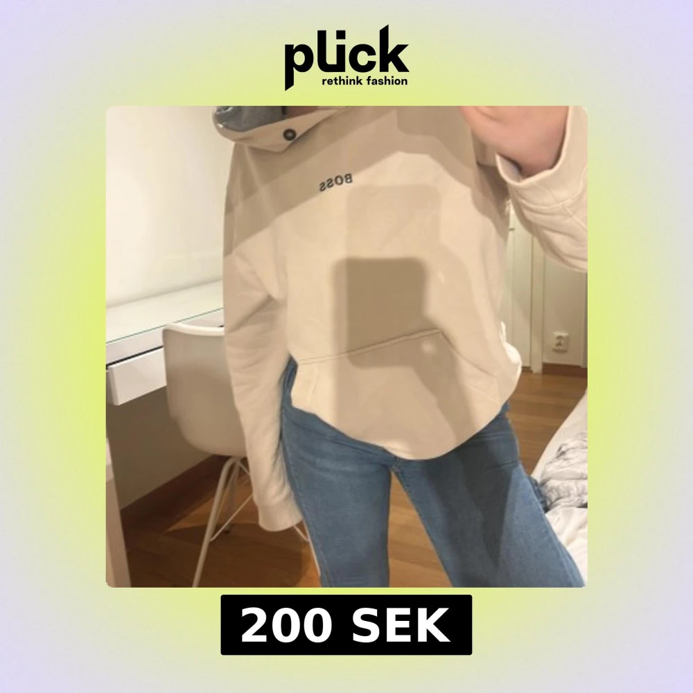 Säljer en beige hoodie från BOSS med svart broderad logga på bröstet. Tröjan har en stor huva med grå insida, känguruficka framtill och långa ärmar. Perfekt för en chill och avslappnad stil.