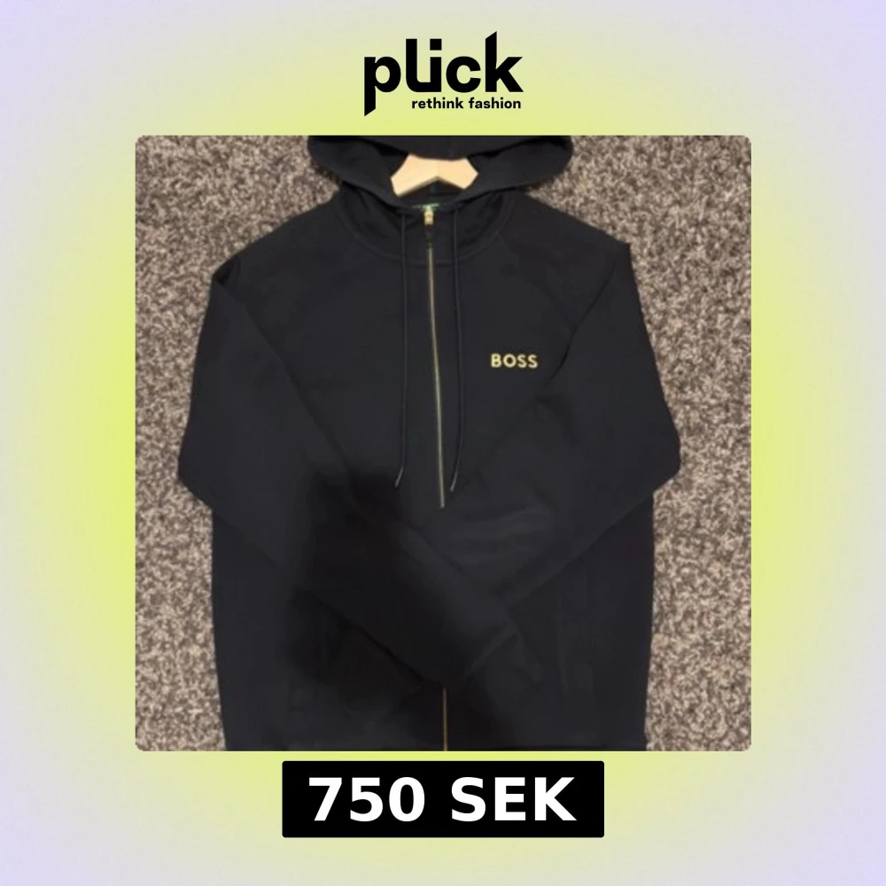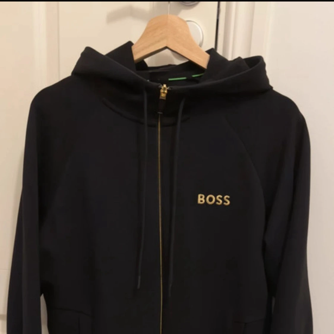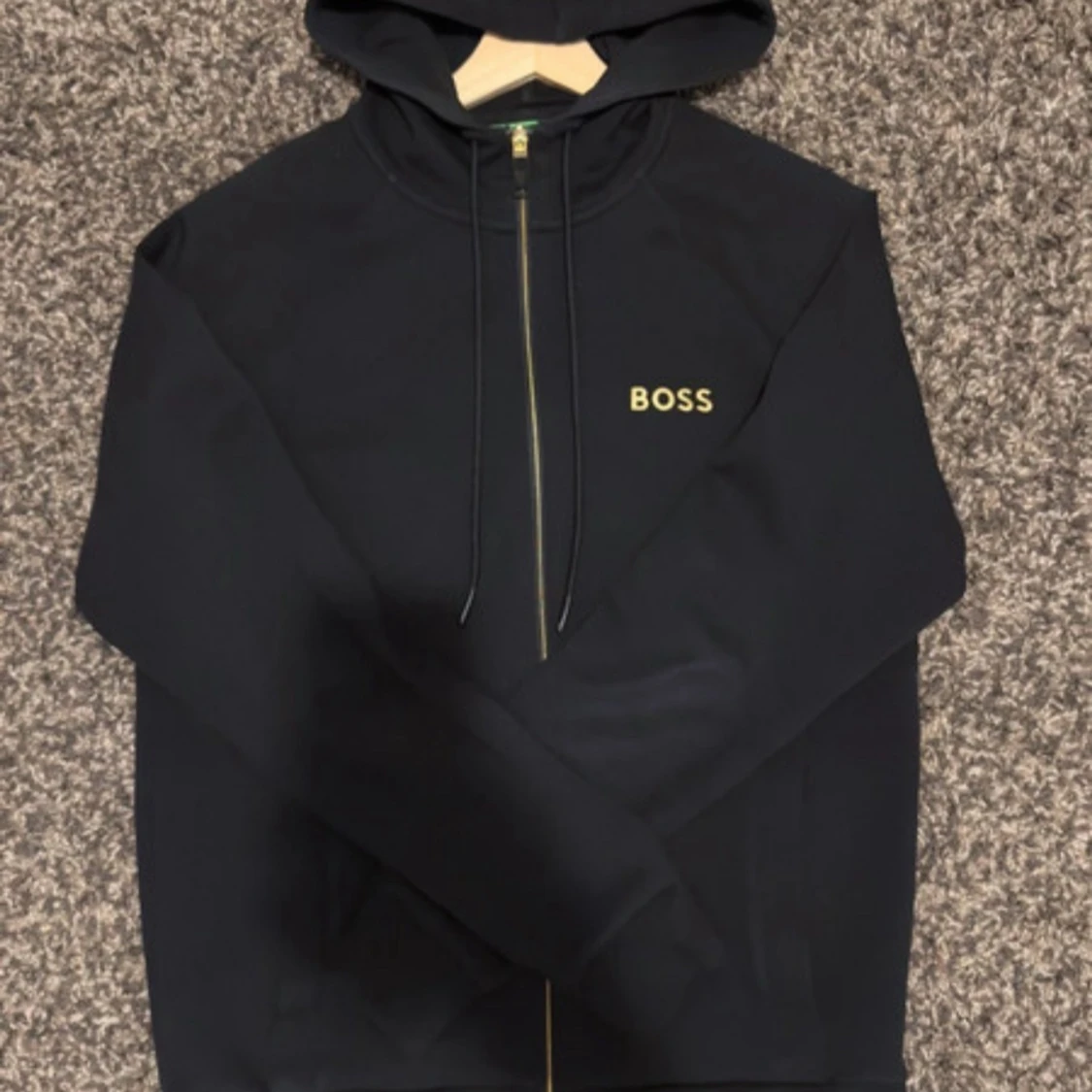 Svart hoodie från BOSS med guldfärgad logga på bröstet och hel dragkedja framtill. Tröjan har huva med snörning och långa ärmar. Klassisk och stilren design, perfekt för en chill look.