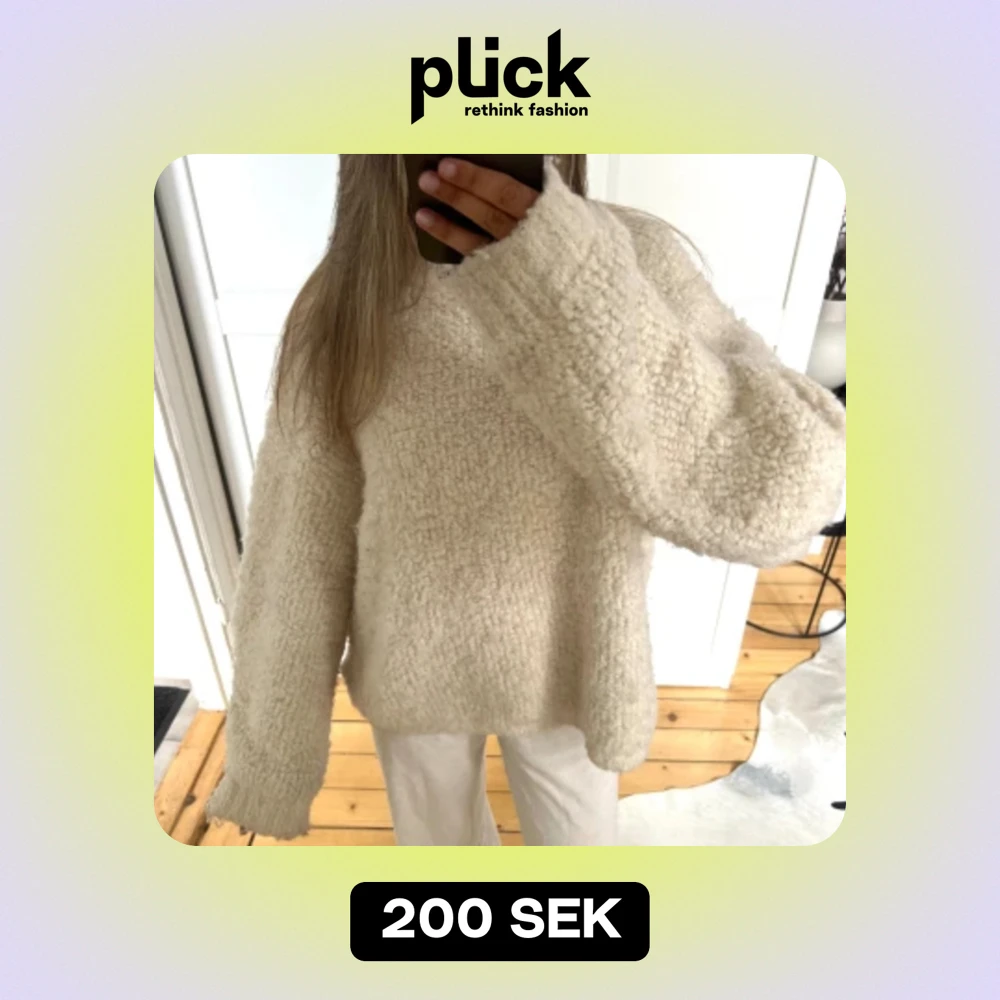 Stickad tröja i Boucle från GinaTricot, färg Warm White. Köptes för 460kr. Använd cirka 3 gånger, säljer då den ej kommer till användning🤍