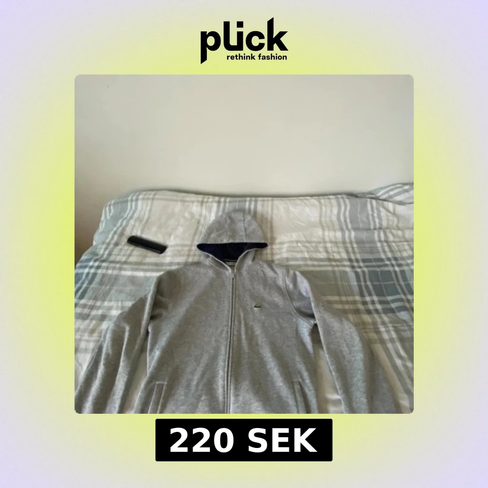 Säljer en grå hoodie från Lacoste med hel dragkedja och klassisk krokodillogo på bröstet. Tröjan har huva med mörkblå insida och två fickor framtill. Perfekt för chill dagar och enkel att matcha med jeans eller joggers.