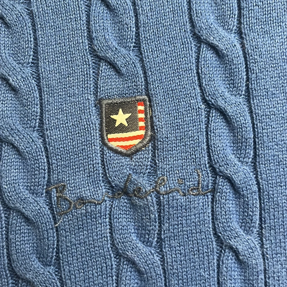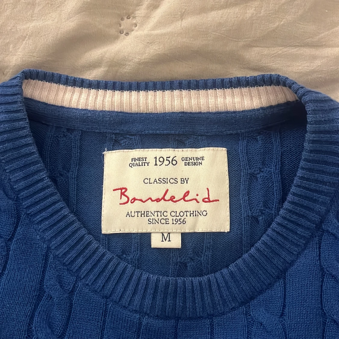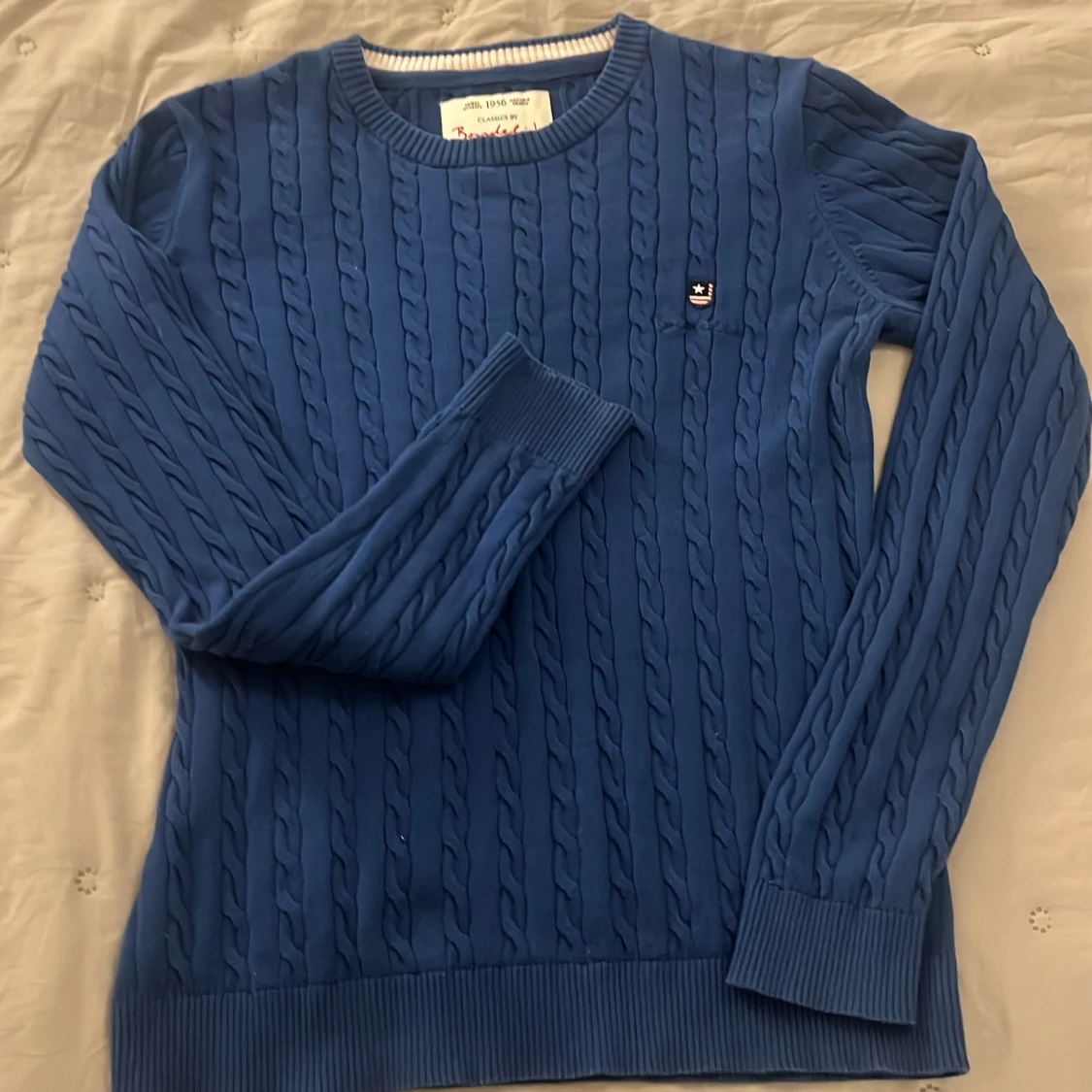 Säljer en snygg blå stickad tröja från Bondelid med kabelstickat mönster, i bra skick.