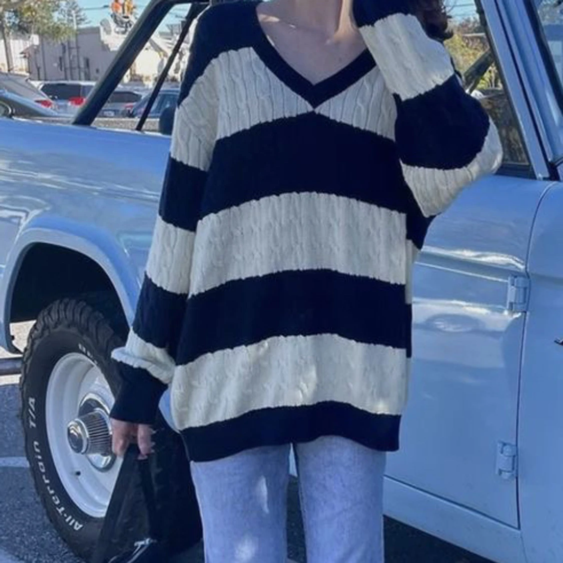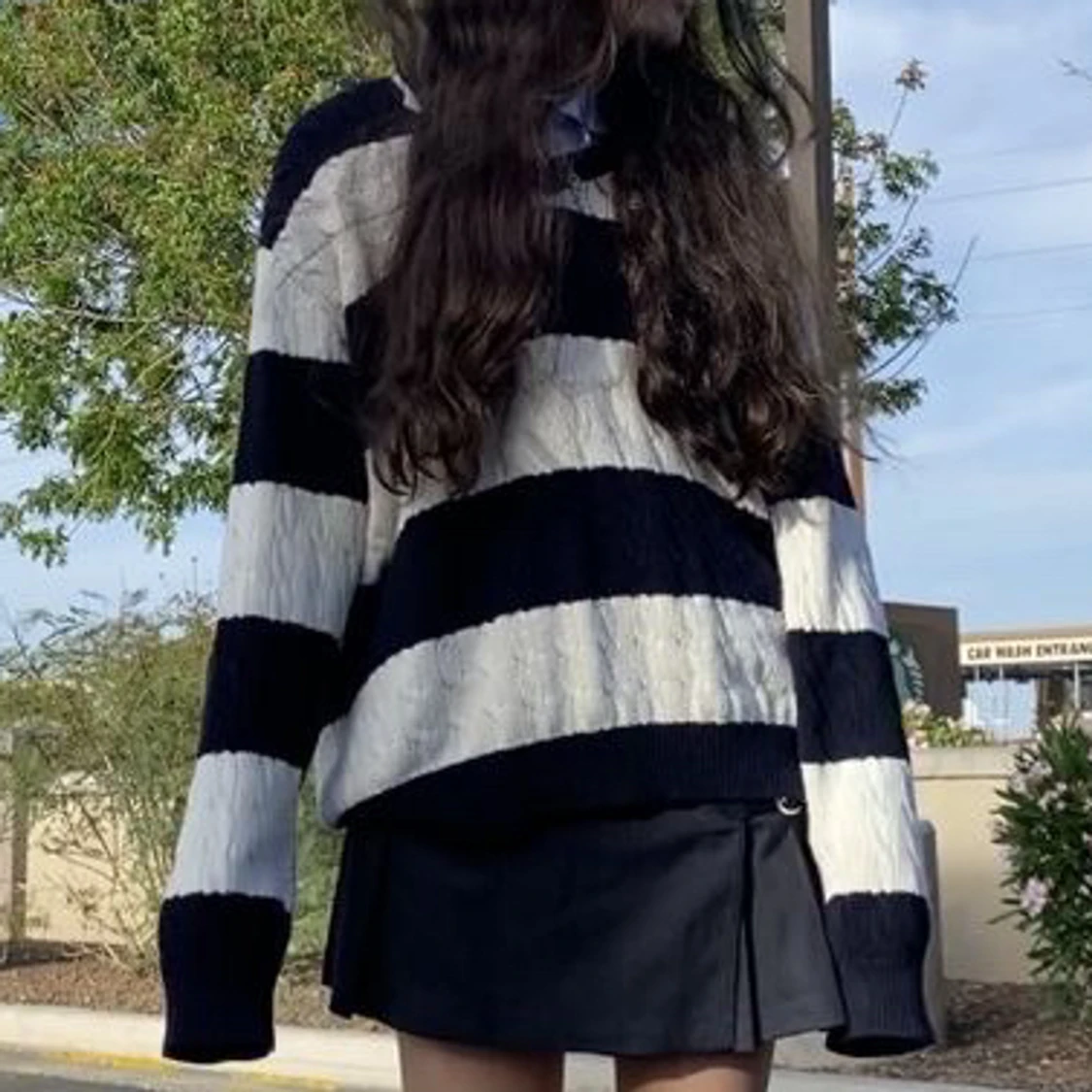 Aka ”nikki cotton striped sweater”. Har varsamt använts och är som ny. Den är oversized för mig som är 159 och bär storlek S. Tröjan är vit och svartblåish beroende på ljuset. Köpare står för frakt💕
