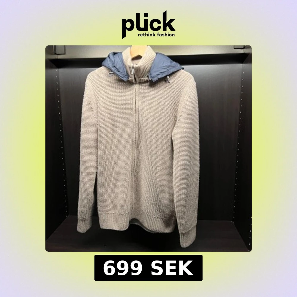 Säljer en snygg beige stickad tröja från Massimo Dutti med dragkedja och en avtagbar blå huva. Perfekt för kyliga dagar med sin mysiga och stilrena design. Tröjan har långa ärmar och ribbade muddar för extra komfort.