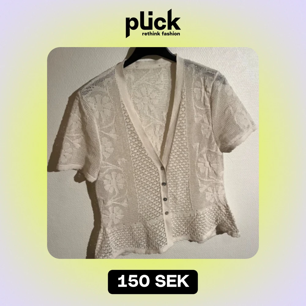 Broderad, stickad kofta med korta ärmar. Färgen är offwhite. Pärlfärgade knappar. Superfin att ha som den är eller med ett linne under! Mycket gått skick och använd ett fåtal gånger.