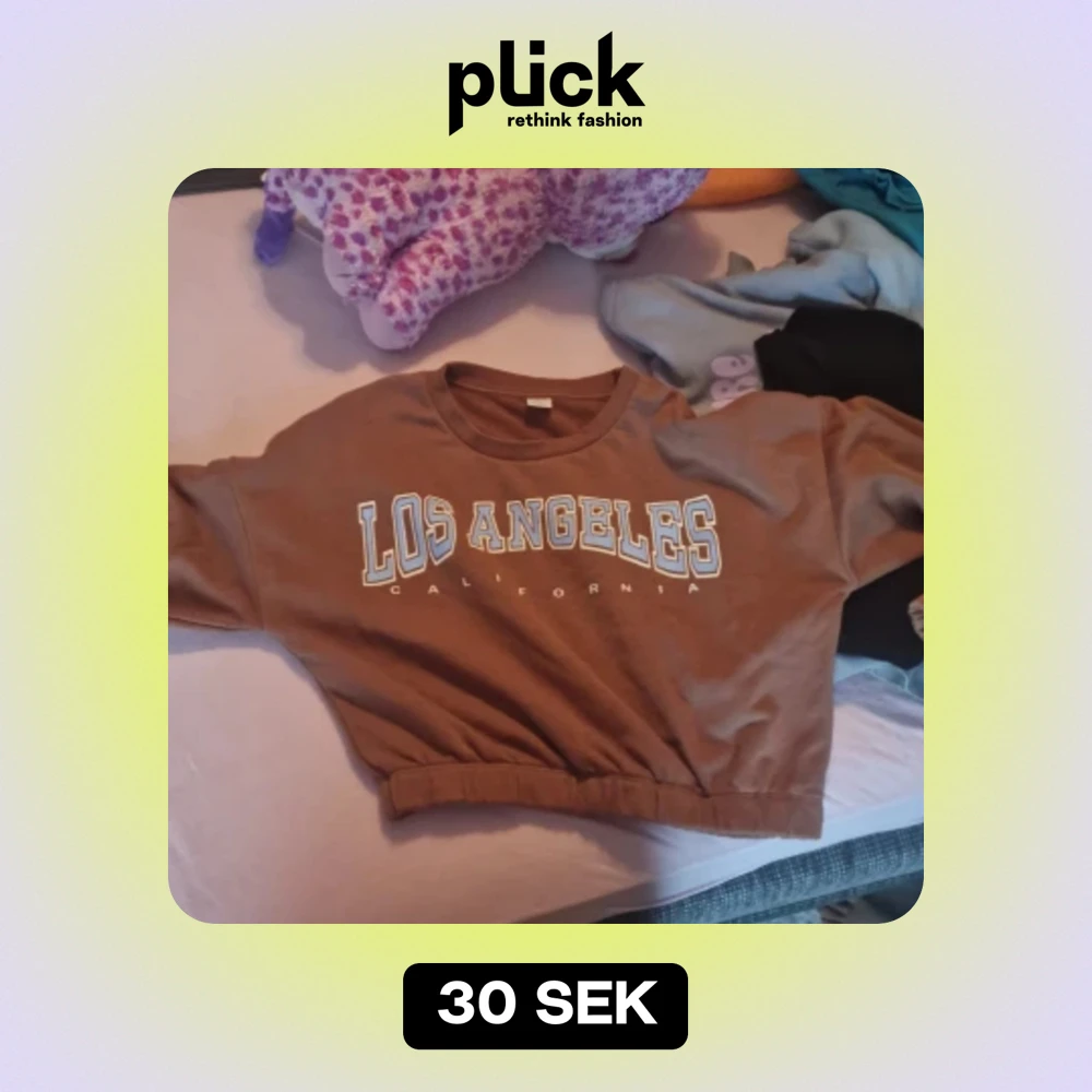 Säljer en supercool brun croppad tröja från Lindex med texten 'Los Angeles California' på framsidan. Perfekt för en avslappnad stil och passar bra till jeans eller leggings. Tröjan är i bra skick och redo för nya äventyr!