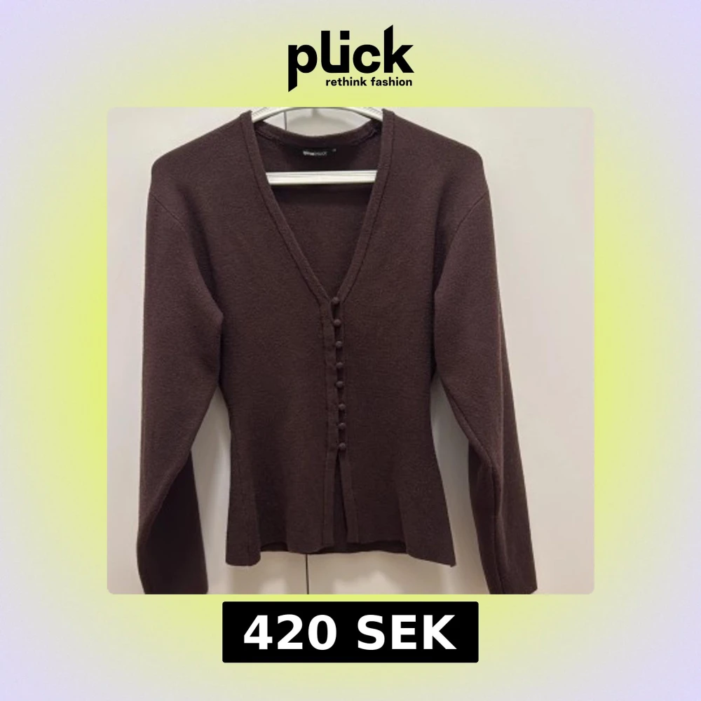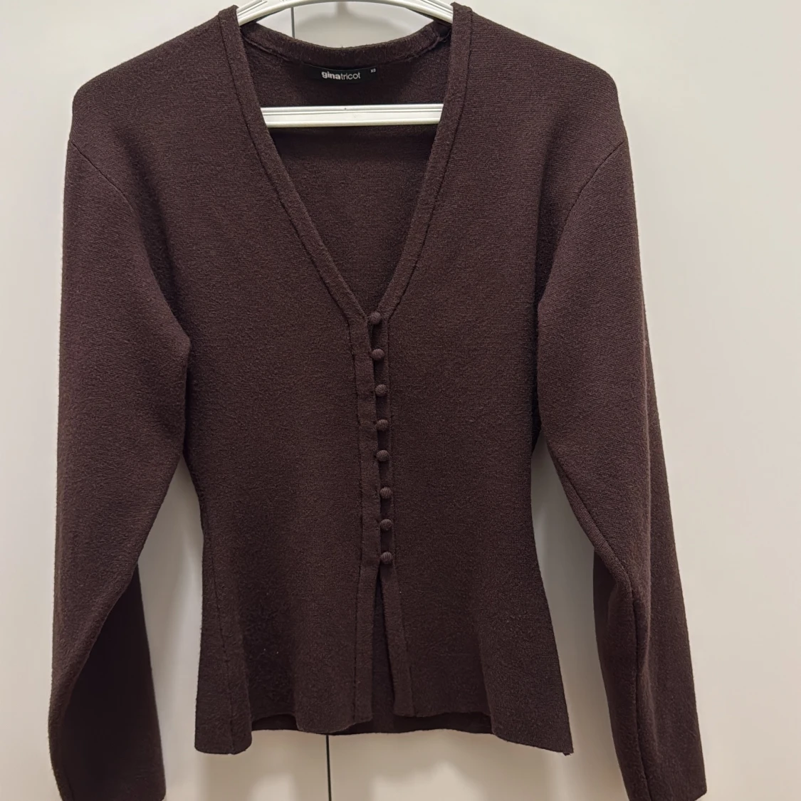Snygg brun kofta från Gina Tricot med v-ringning och dekorativa knappar framtill. Modellen har långärmade och är tillverkad i ett mjukt stickat material som känns skönt mot huden. Perfekt att styla med jeans eller kjol för en chill look.