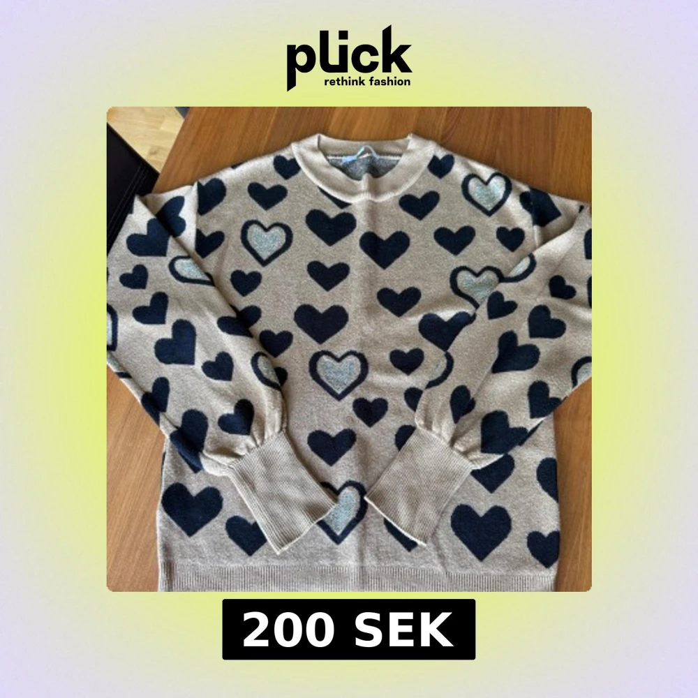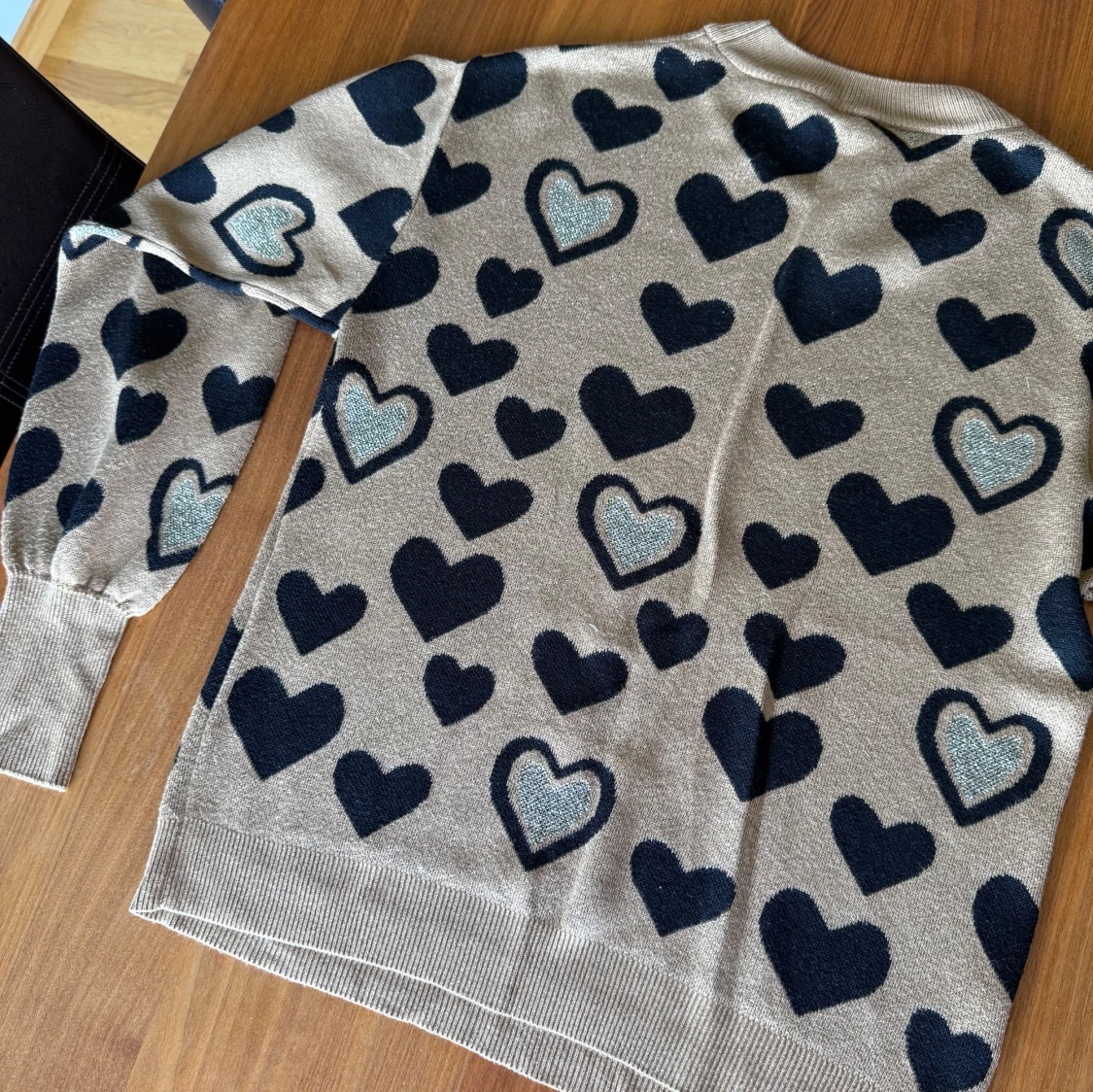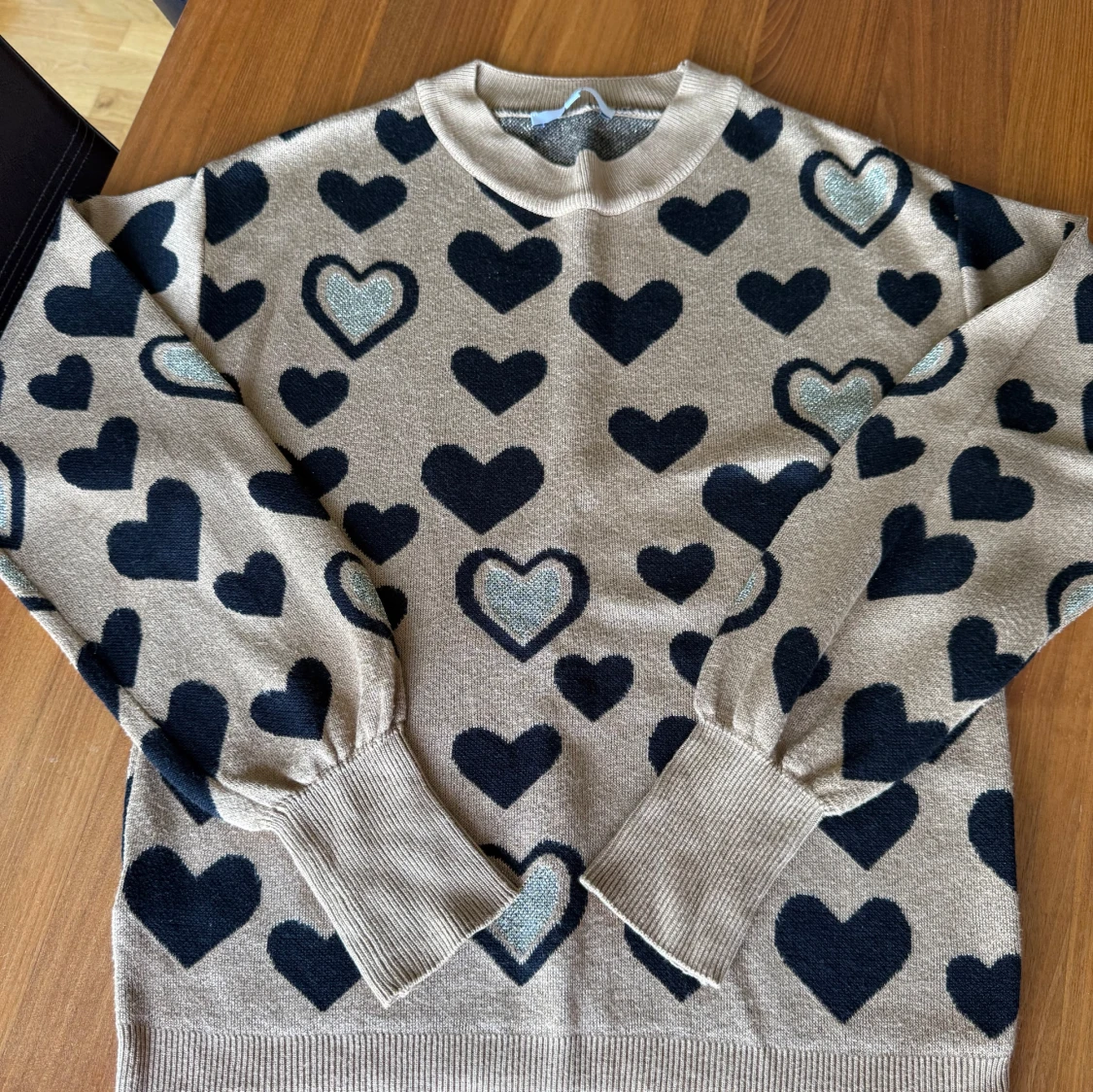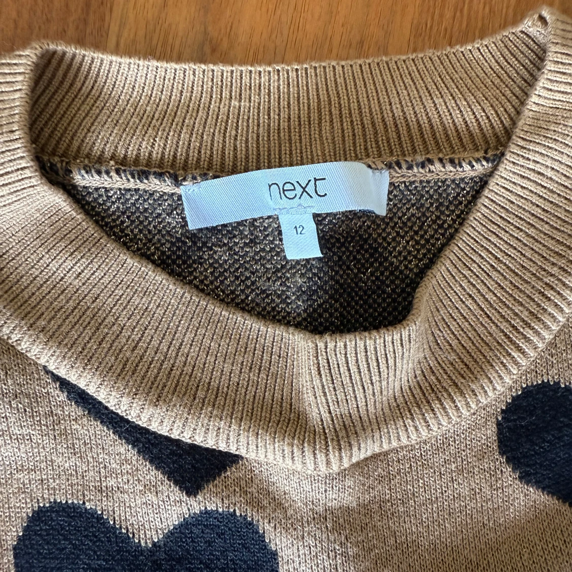 Superfin brun tröja från Next med svarta och guldiga hjärtan över hela. Guldiga trådar i hela tröjan. Tröjan har rund hals, långa ärmar och breda ribbade muddar. Perfekt för dig som gillar gulliga detaljer och vill sticka ut lite extra.