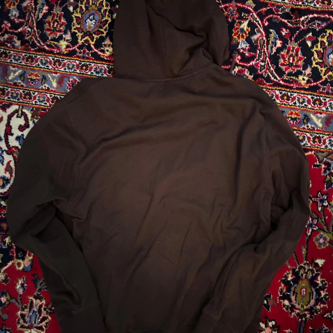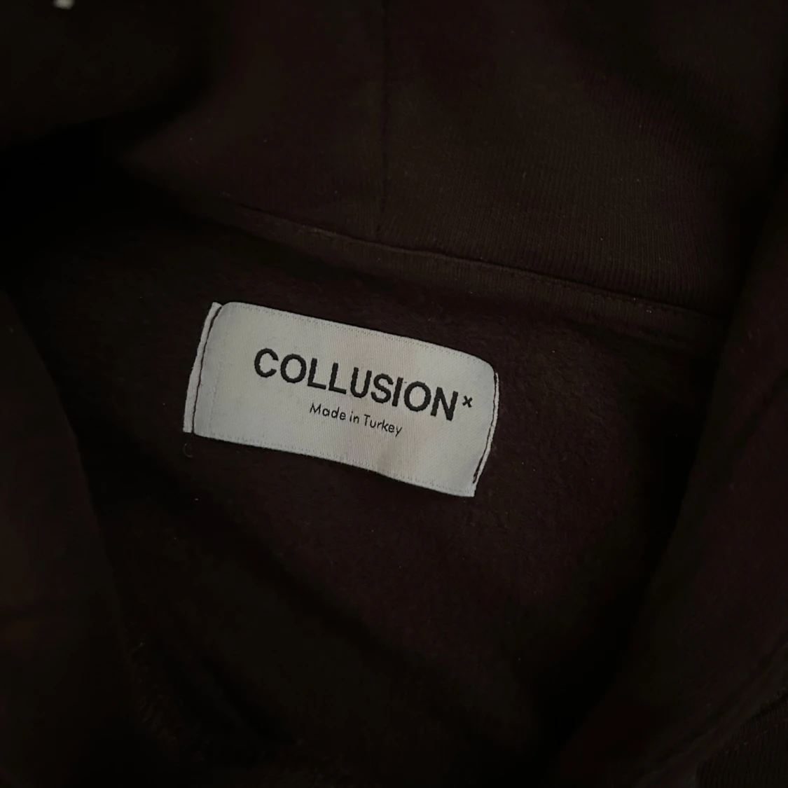 Säljer en brun hoodie från COLLUSION med en stor beige cirkel och grafiskt tryck på bröstet. Tröjan har huva med dragsko och en klassisk känguruficka framtill. Perfekt för en avslappnad stil.