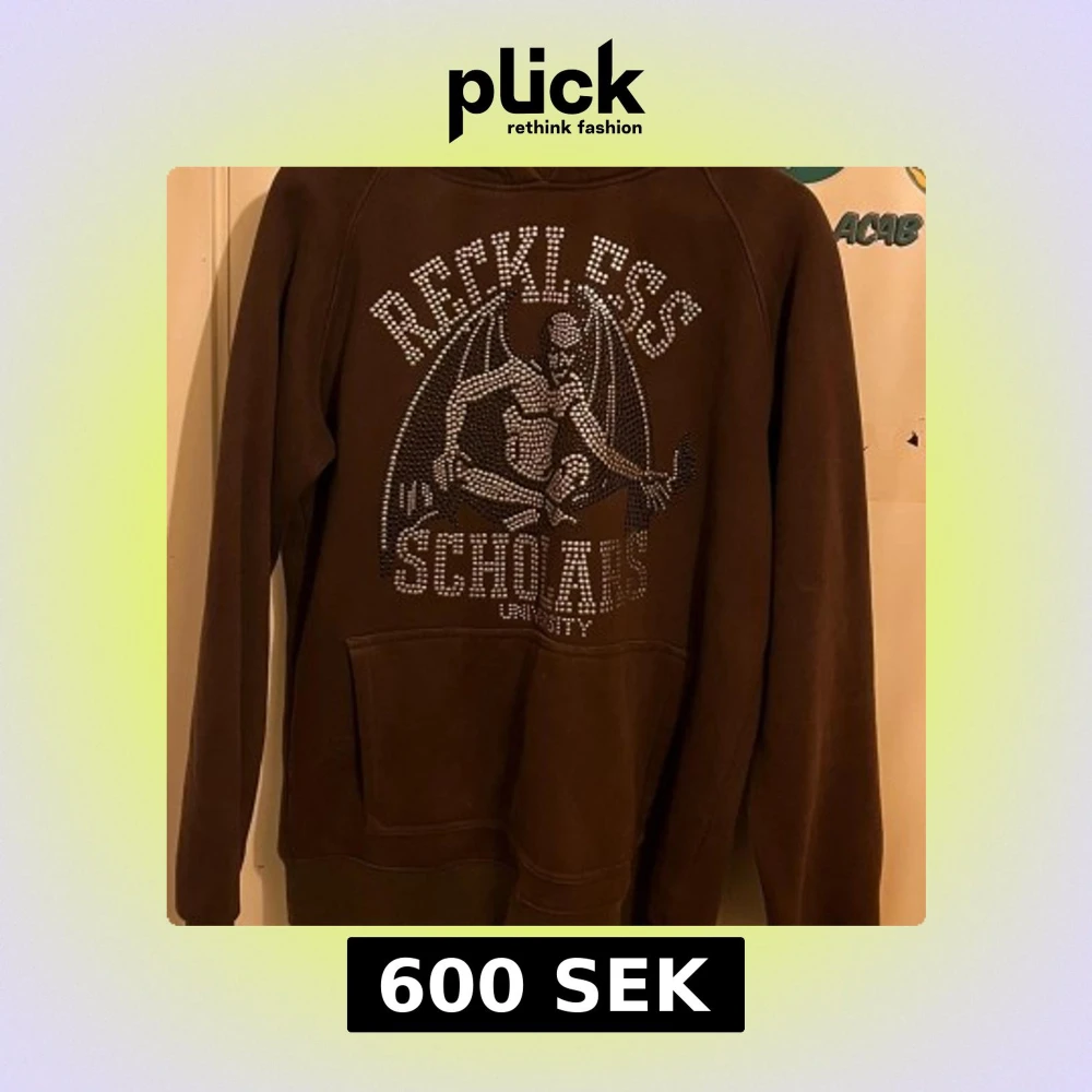 Cool brun hoodie från Reckless Scholars med ett stort tryck av en demon och texten 'Reckless Scholars' i silverfärgade nitar.