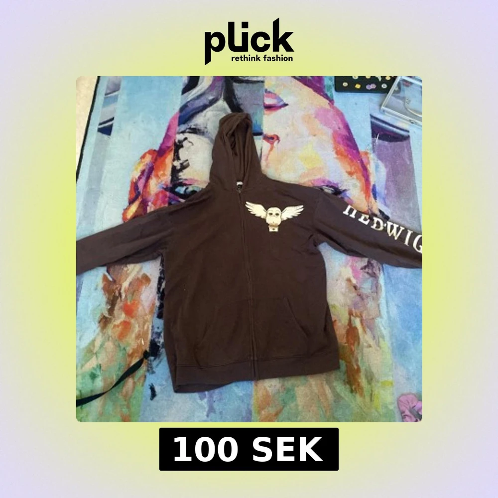 Säljer en brun hoodie från H&M med dragkedja och stor huva. På bröstet och ryggen finns ett stort tryck av ugglan Hedwig från Harry Potter och texten 'HEDWIG' på ena ärmen. Perfekt för dig som älskar magi och vill ha en chill look.