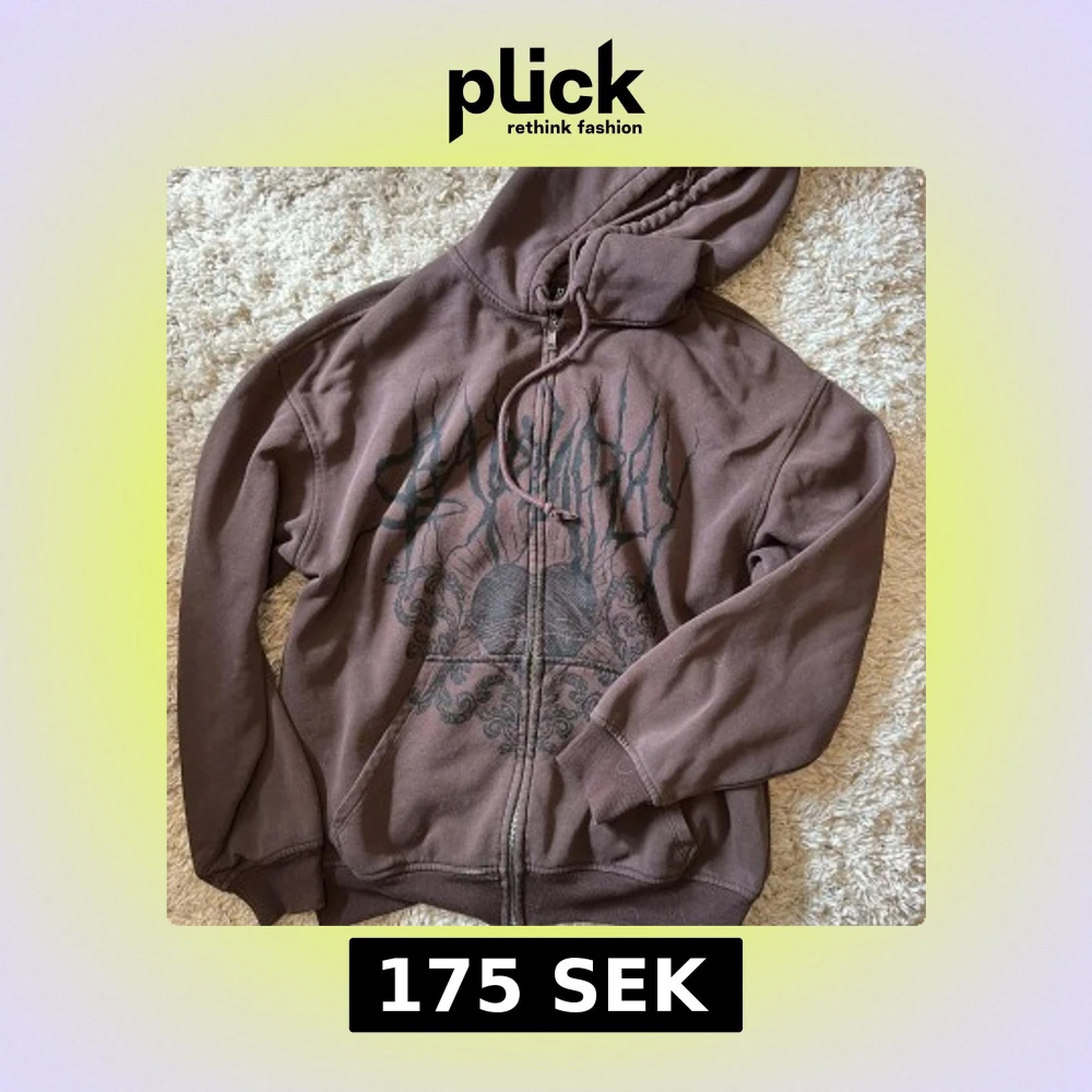 Säljer en brun hoodie från Divided by H&M i storlek XS. Tröjan har dragkedja framtill, huva med dragsko och ett stort grafiskt tryck på framsidan. Mjuk insida och ribbade muddar vid ärmslut och nederkant. Nåpprig på insidan (se sista bild). Oversized.